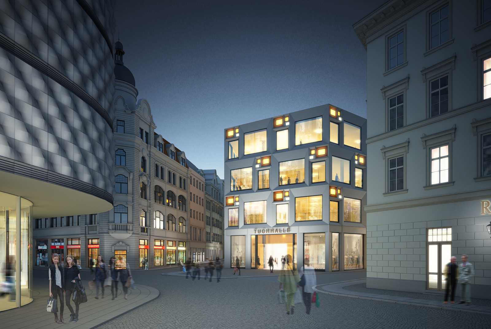 Für die acht eingeladenen Teilnehmer galt es, über vier Geschosse fast 190 Meter Fassade zu entwerfen, die mit dem Inneren korrespondiert, und auf die Eingänge, die Anlieferung und das Konstruktionsraster von 8 x 8 Meter entlang der Großen Fleischergasse (mit lastabtragenden Stützen) und 8,25 x 8,25 m entlang der Hainstraße (stützenfrei, vorgehängt) reagiert. Zugleich sollte sie flexibel für sich ändernde Geschäftszuschnitte sein, Werbeflächen integrieren und natürlich repräsentieren.