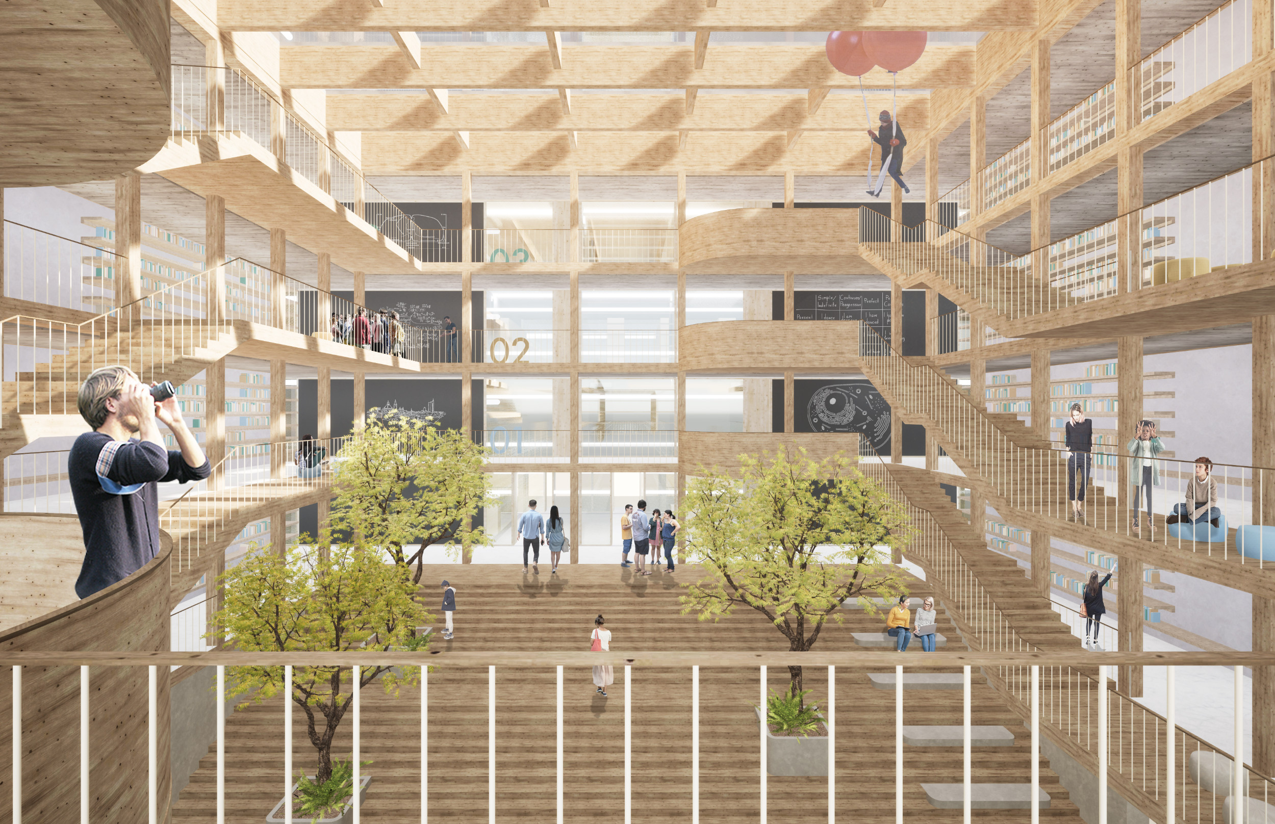 Auf jeder Etage entstehen zwei Flex-Cluster, bestehend aus den allgemeinen Unterrichtsräumen einer Jahrgangsstufe, einem Teambereich, Lagerflächen sowie technischer und sanitärer Infrastruktur. Die Mitte des Clusters bildet ein als Freilernbereich nutzbarer „Marktplatz“. Zwischen den beiden Clustern sind zentrale Bereiche wie Fachunterrichtsräume, Bibliothek und Verwaltung angeordnet. Gruppen-, Kurs- und DAZ-Räume an dieser Schnittstelle lassen sich organisatorisch flexibel den Clustern oder den zentralen Bereichen zuordnen. Im obersten Geschoss ergänzen die naturwissenschaftlichen Unterrichtsräume das Raumprogramm der Schule. Die Nutzbarkeit der Dachflächen als Garten wird in der weiteren Planung geprüft. Die neuen Bauteile sind als leichte Konstruktion geplant; sollten die Tragreserven des Bestands nicht ausreichen, kann die Lastabtragung über neue Strukturelemente erfolgen.