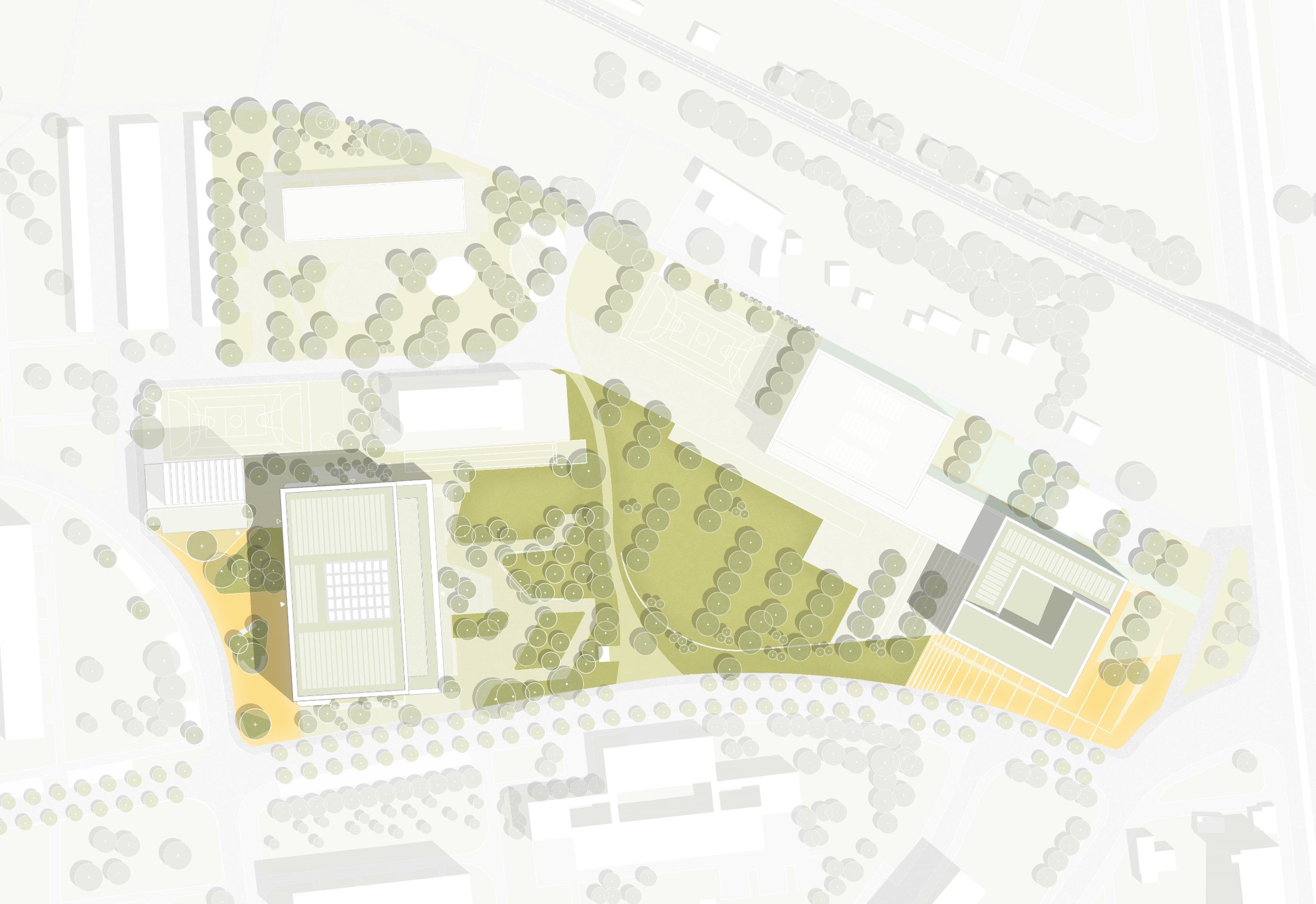 Die Neubauten der beiden Schulen markieren den östlichen und westlichen Auftakt des neuen „Bildungsboulevards“ Arthur-Nagel-Straße. Als städtebauliche Solitäre prägen sie die Identität des Quartiers und fügen sich selbstbewusst in die bestehende Umgebung ein. Die Grünflächen liegen im Zentrum des Gebietes und bilden einen Teil des ökologischen Kontinuums, das sich vom Küchenholz bis zum Kulkwitzer See erstreckt – ein Gefüge aus Wald, Park, Kleingärten und landwirtschaftlich genutzten Flächen.