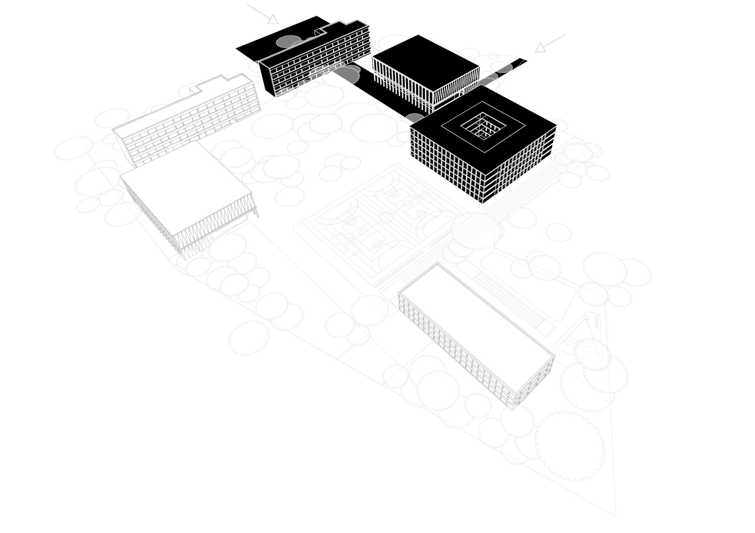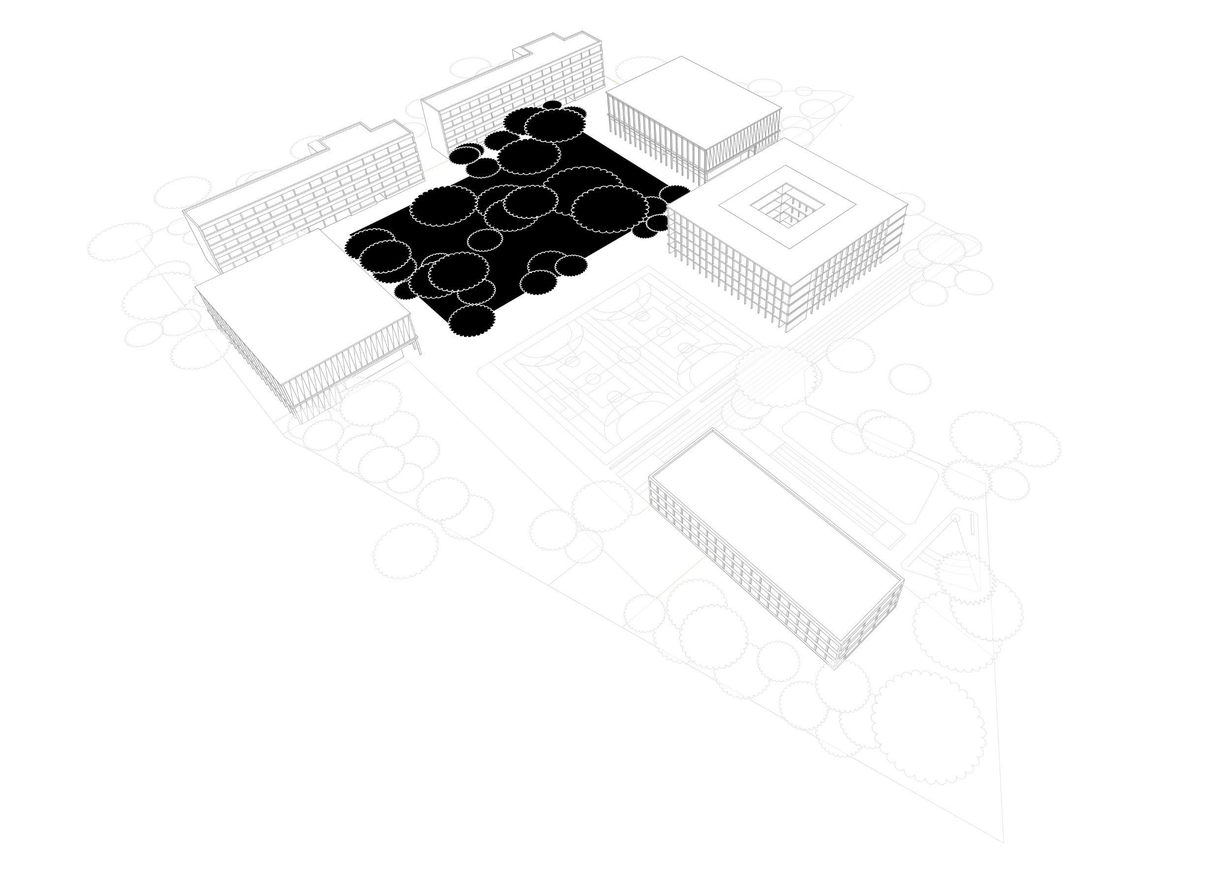 Der Fokus der Freiraumgestaltung liegt auf einem achtsamen Umgang mit dem vorhandenen Baumbestand. Mit der Neugestaltung der Flächen wird ein identitätsstiftender grüner Campuspark entwickelt. Es entsteht ein angenehmer und gesunder Ort der Kommunikation und Erholung.Die Eingriffe in den Baumbestand sind minimiert. Die neuen Gebäude besetzen im Wesentlichen die Baufelder der abzubrechenden Gebäudesubstanz.