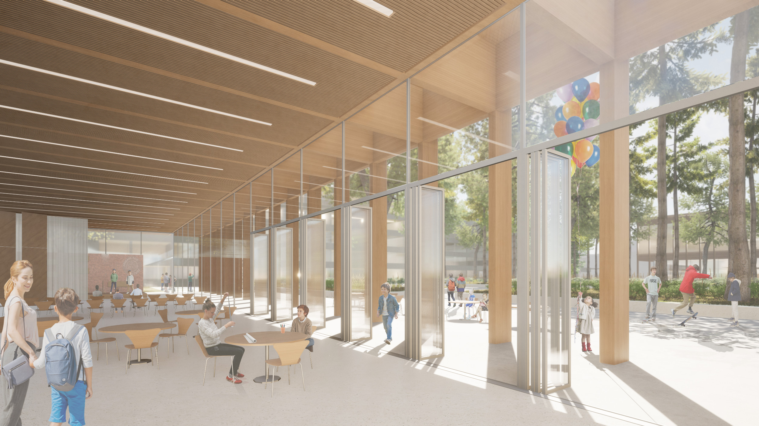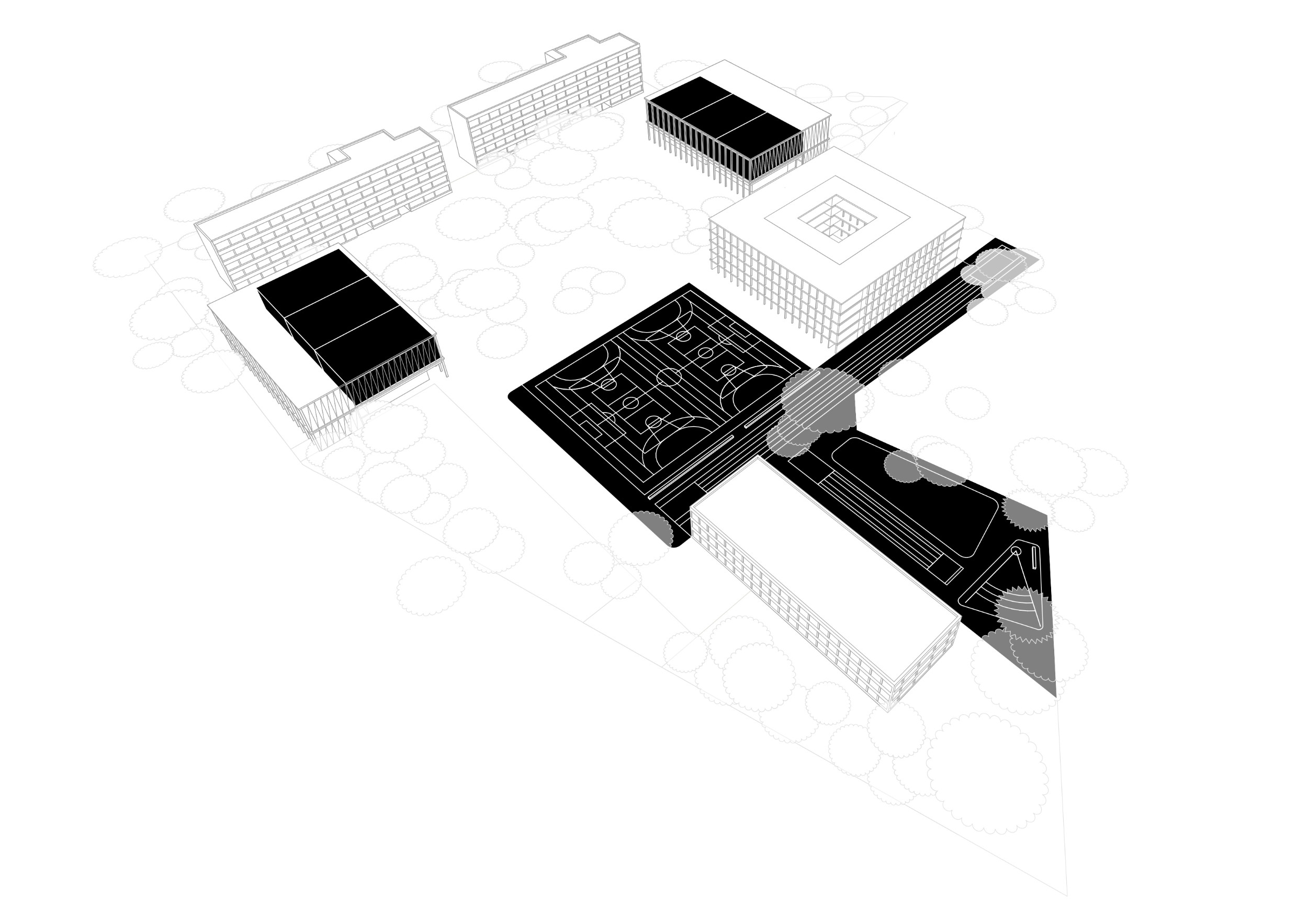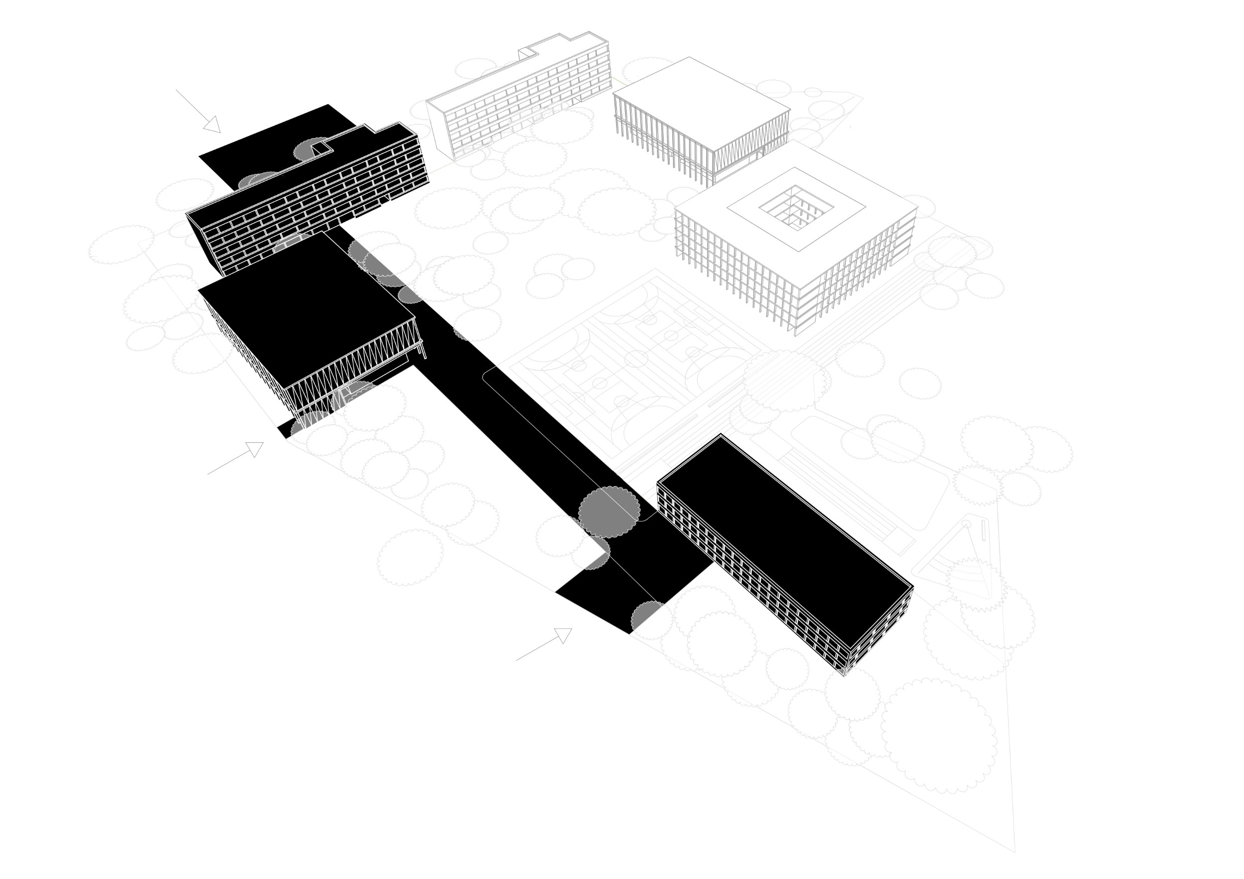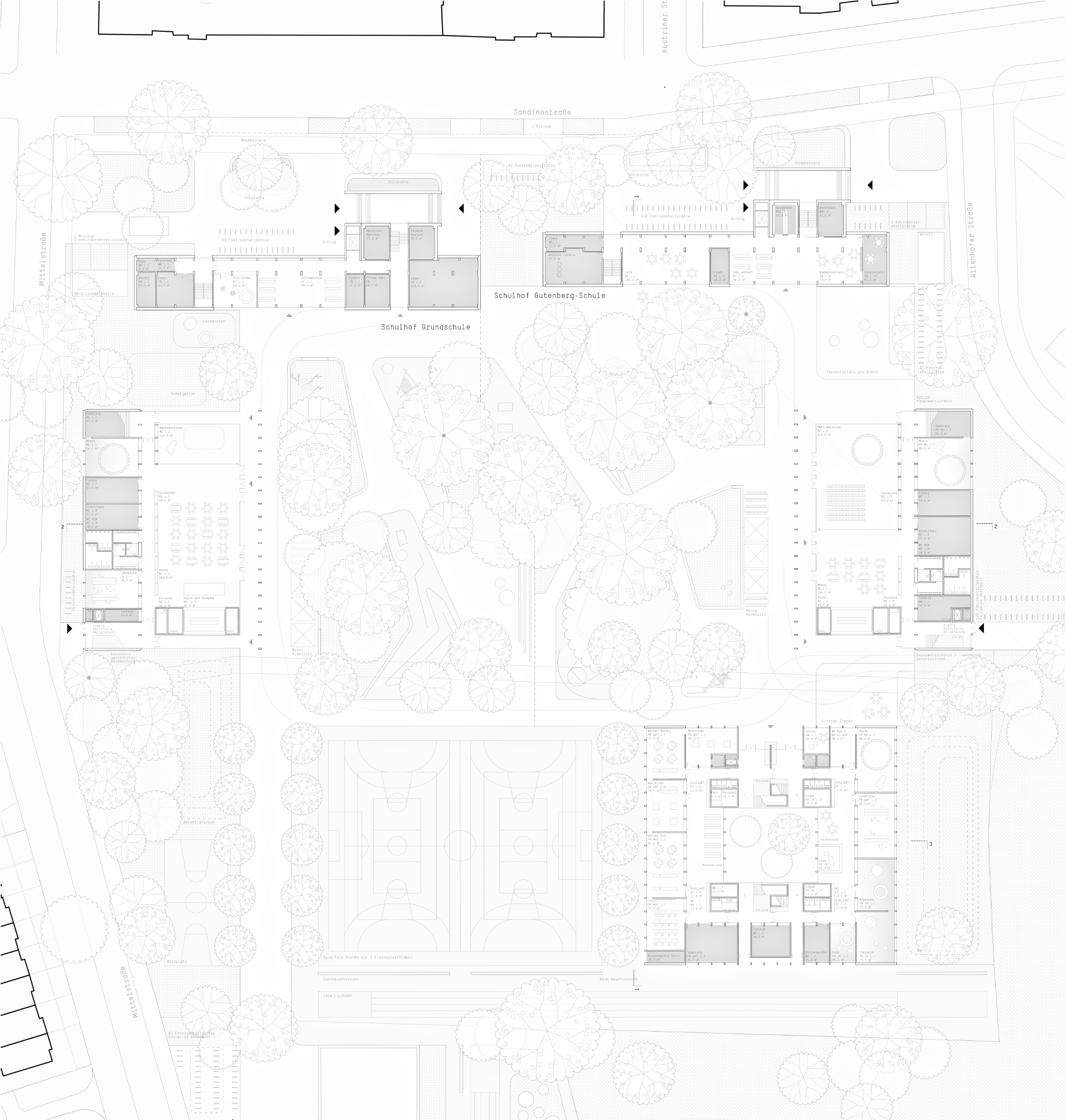 Die Typologie der offenen Baustruktur wird fortgeschrieben. Zur Sandinostraße als zentrale Adresse der Schulen wird ein Eingangsplatz mit Aufenthaltsqualitäten ausgebildet. Dieser ist der morgendliche Treffpunkt für die ca 1.800 Schülerinnen und Schüler. Die zwei neuen Baukörper mit den zentralen Funktionen der Schulen – die Community-Hubs - besetzen den Straßenraum an Mittelstraße und an der Altenhofer Straße. Der Community-Hub als aktiver Mittelpunkt der Schule ist jeweils der zentrale Kubus des Ensembles .Die drei Baukörper jeder Schule sind durch den Schulboulevard verbunden.