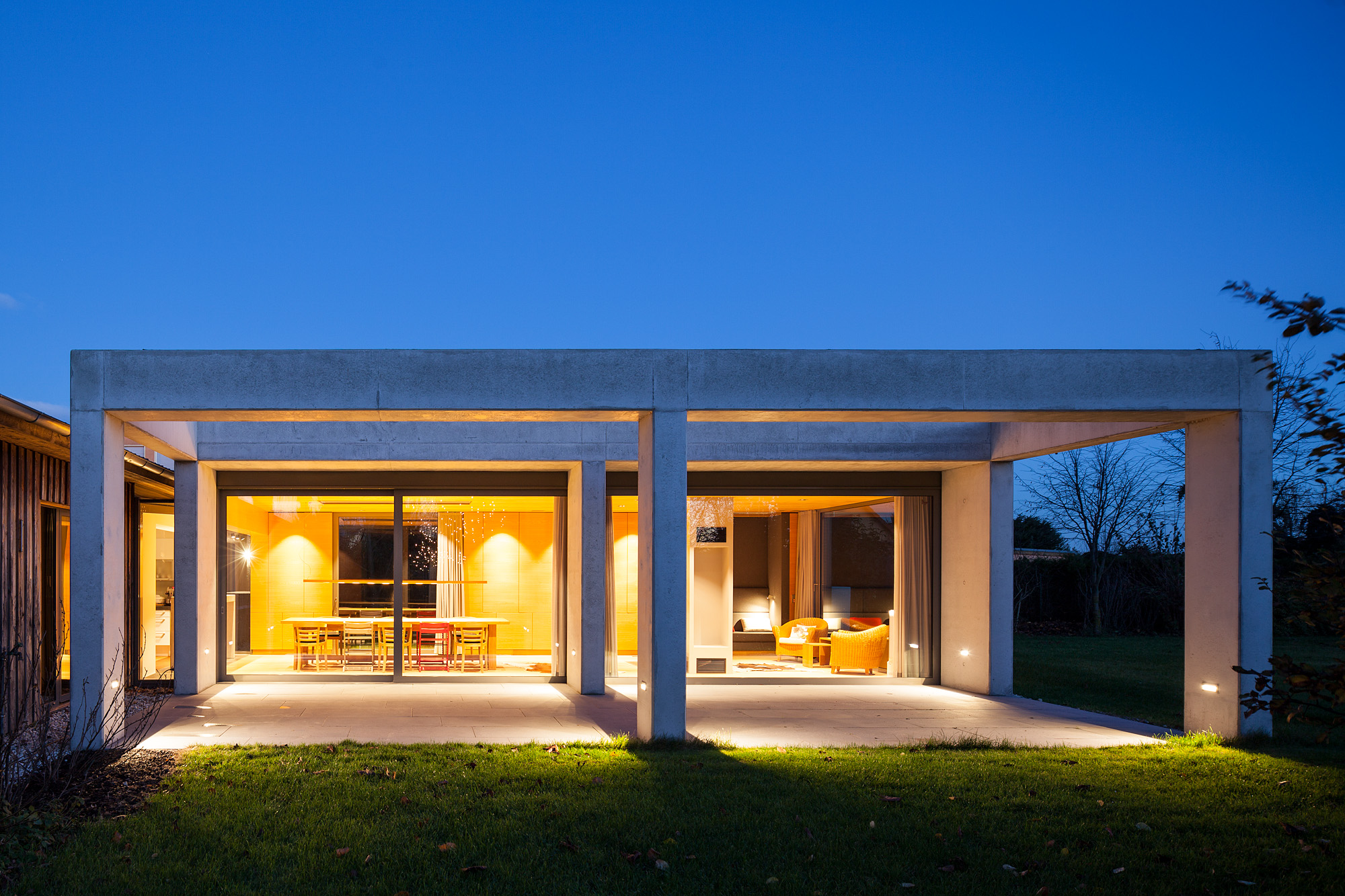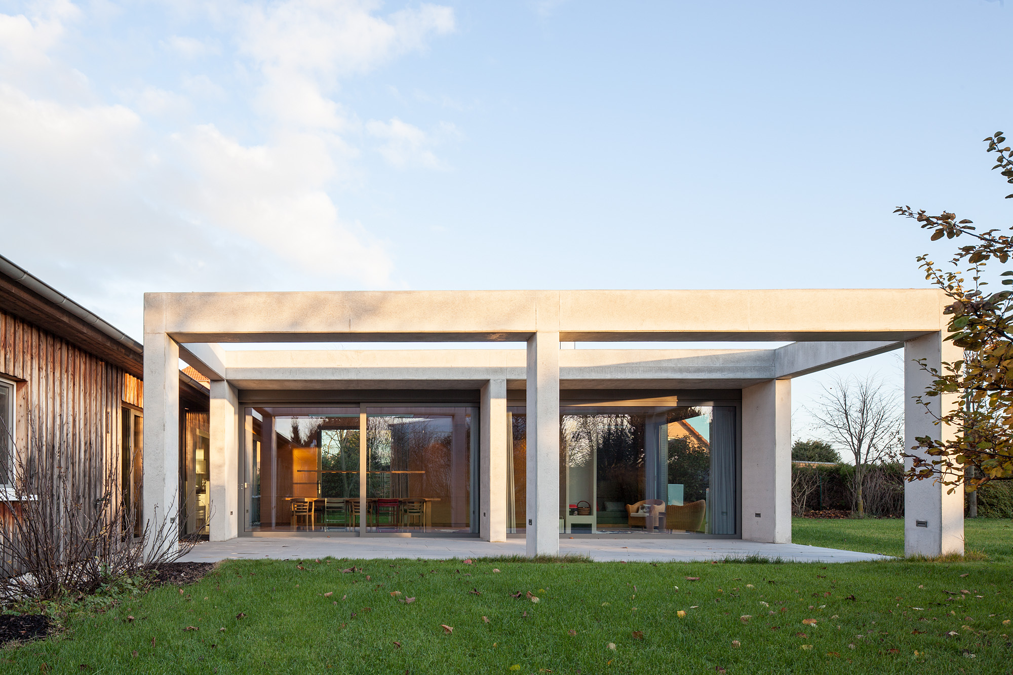 Eine siebenköpfige Familie, die einen Landhof in der Nähe Leipzigs bewohnt, wünschte sich eine Erweiterung ihrer Wohnfläche um diese als Speise- und Wohnraum zu nutzen. Die Erweiterung wurde von uns als eingeschossiger Pavillon realisiert. Große Öffnungen ermöglichen die Aussicht in den Garten. An warmen Tagen können die Fenster komplett zur Seite geschoben werden. Die räumliche Grenze ist dann aufgehoben, Innen und Außen gehen fließend ineinander über.
