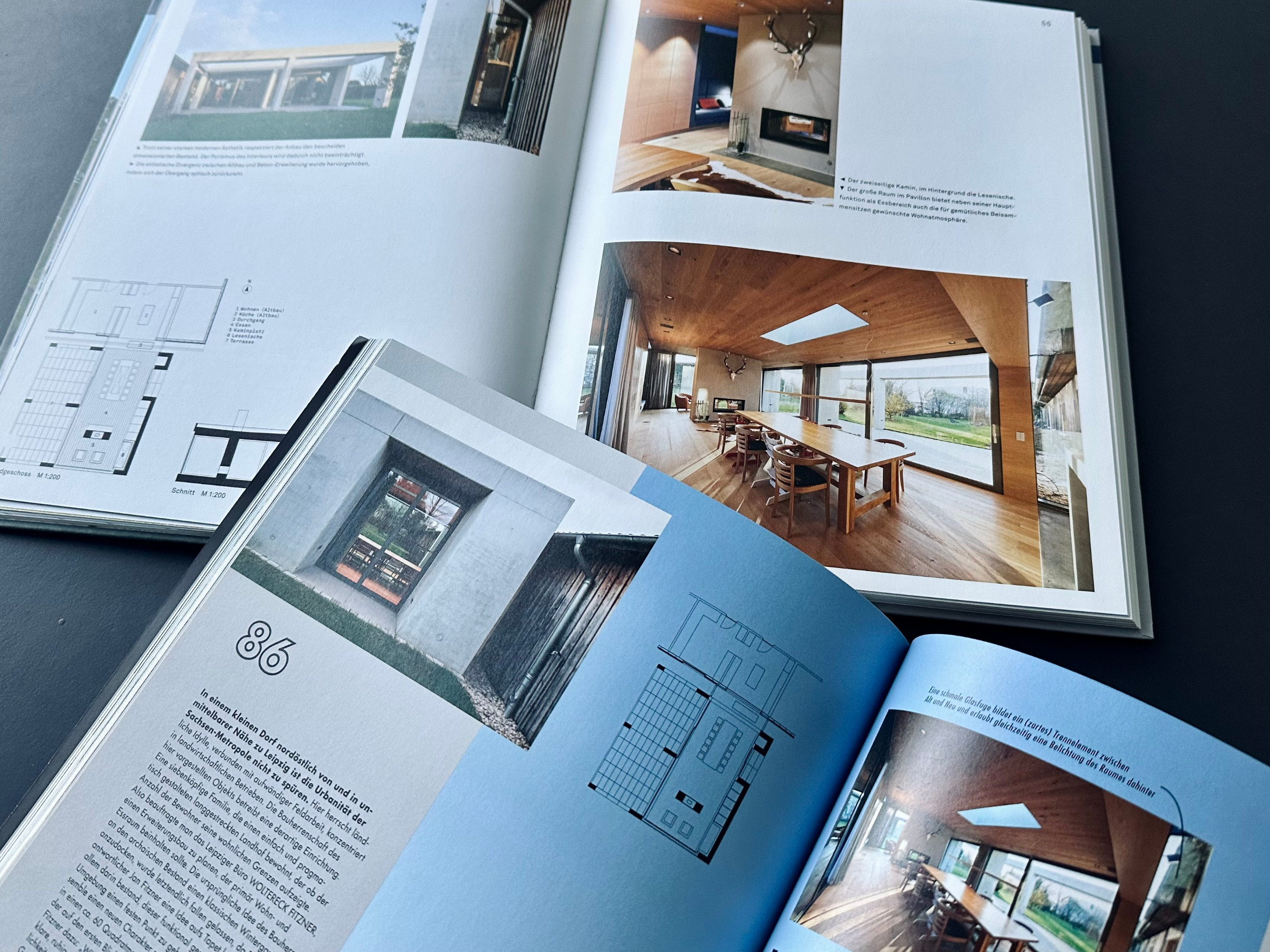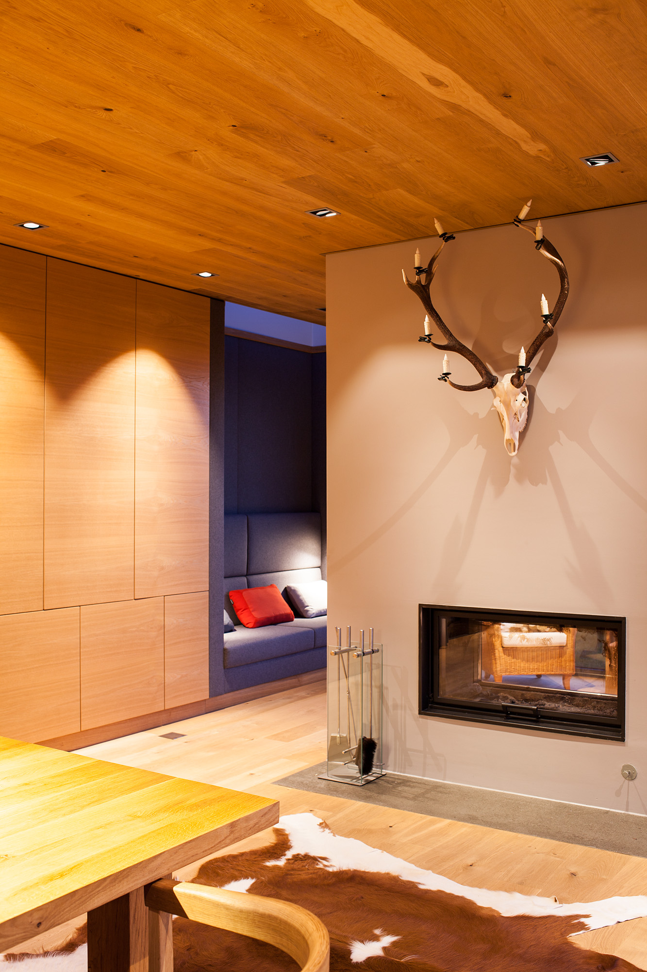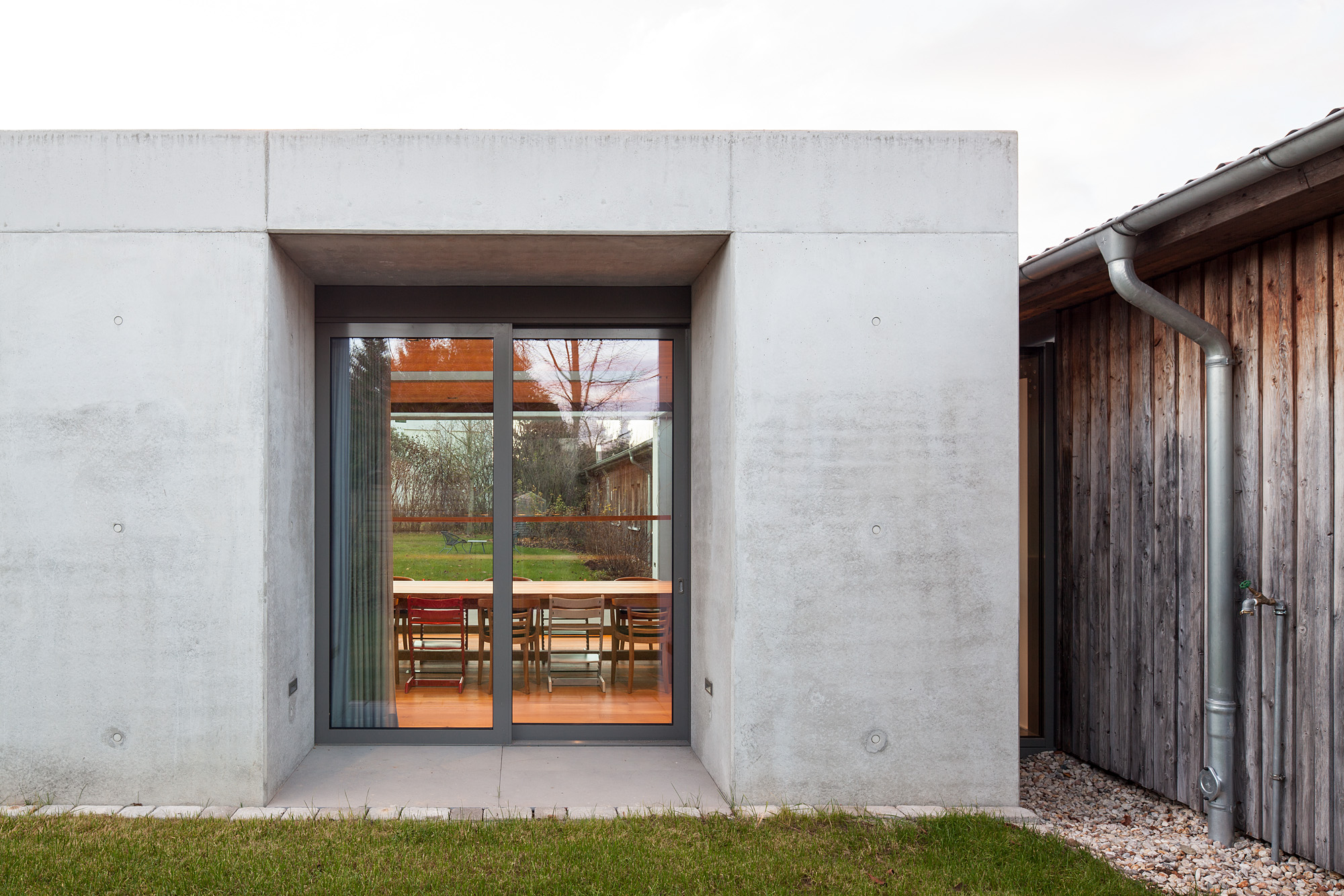 Die Fassade des Kubus ist mit hellem, glatt geschaltem Sichtbeton ausgeführt. Das Gebäudeinnere ist mit Eichenholz ausgekleidet. Den Übergang zum Bestandsgebäude formulierten wir als „gläserne Fuge“ um den Neubau mit einer leicht wirkenden Geste vom Bestand zu lösen. Eine als Lesesofa ausgebildete Wandnische mit eigenem Oberlicht dient als Rückzugsort vom Familienalltag...