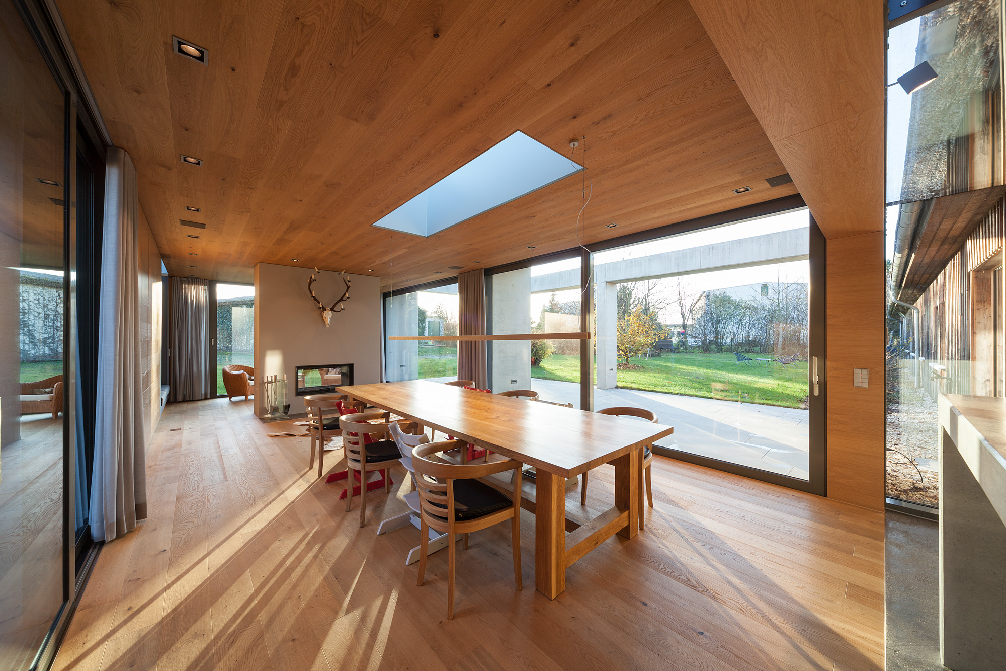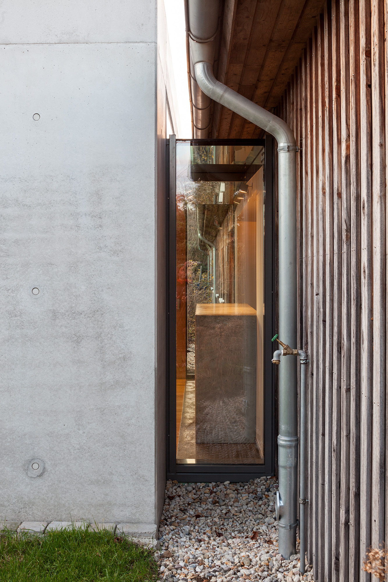 Der Übergang zwischen Innen- und Außenraum ist das zentrale Entwurfsthema des Projektes. Wir haben uns ein Gefäß vorgestellt, dessen Wandungen den neuen Wohnraum umschließen. Diese Hülle sollte sinnlich erlebbar sein. Das Innere warm und weich und das Äußere massiv und skulptural. Der Kontrast zwischen Eiche und Sichtbeton macht diese abstrakte Idee auf eine sehr authentische Weise optisch und haptisch erlebbar.