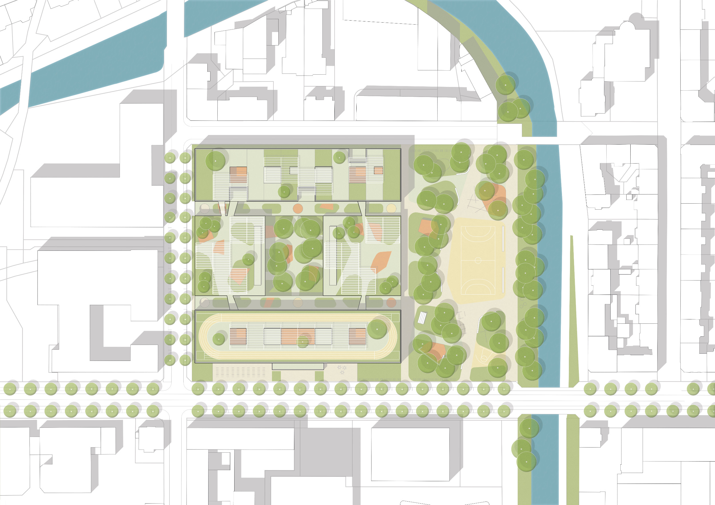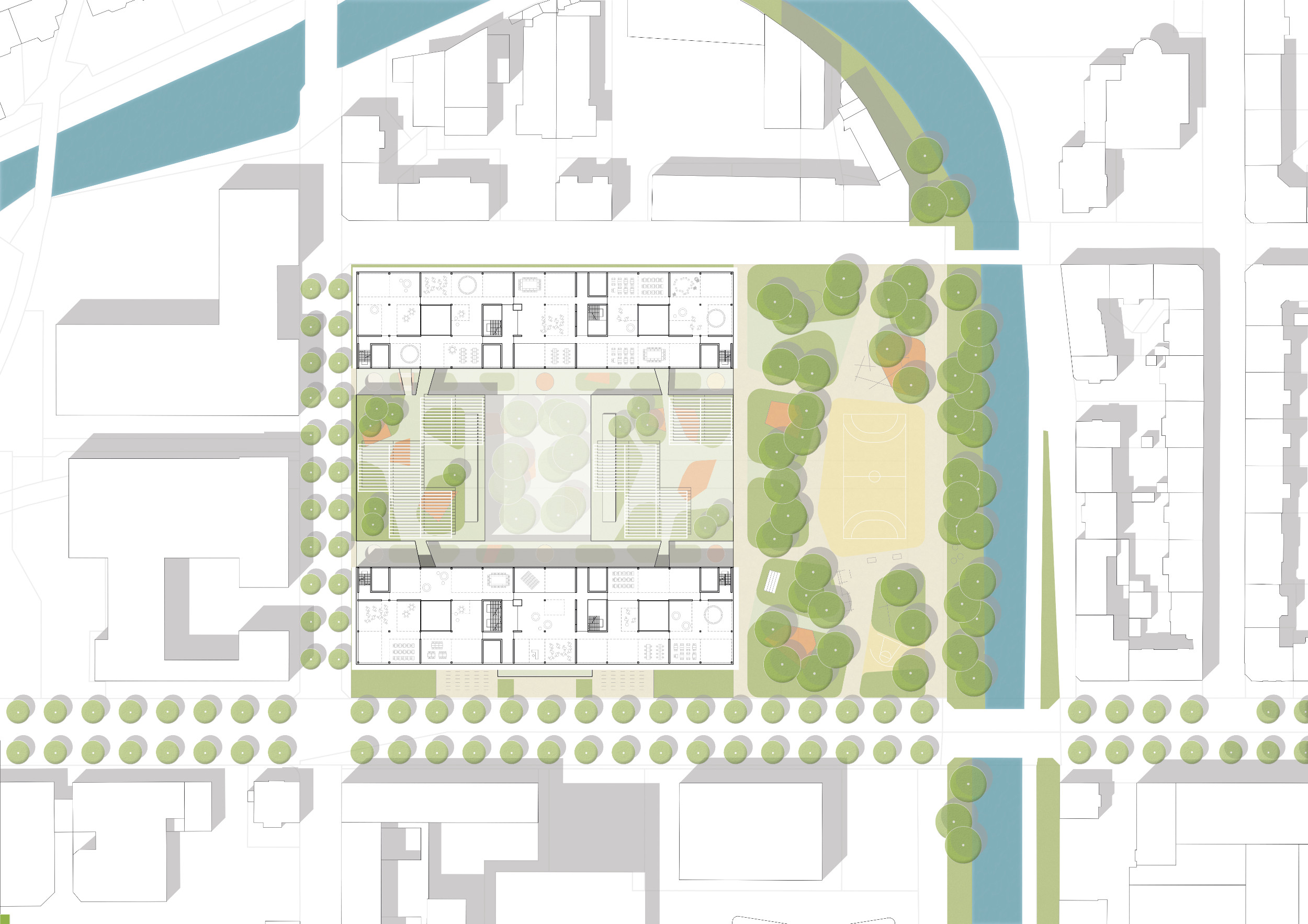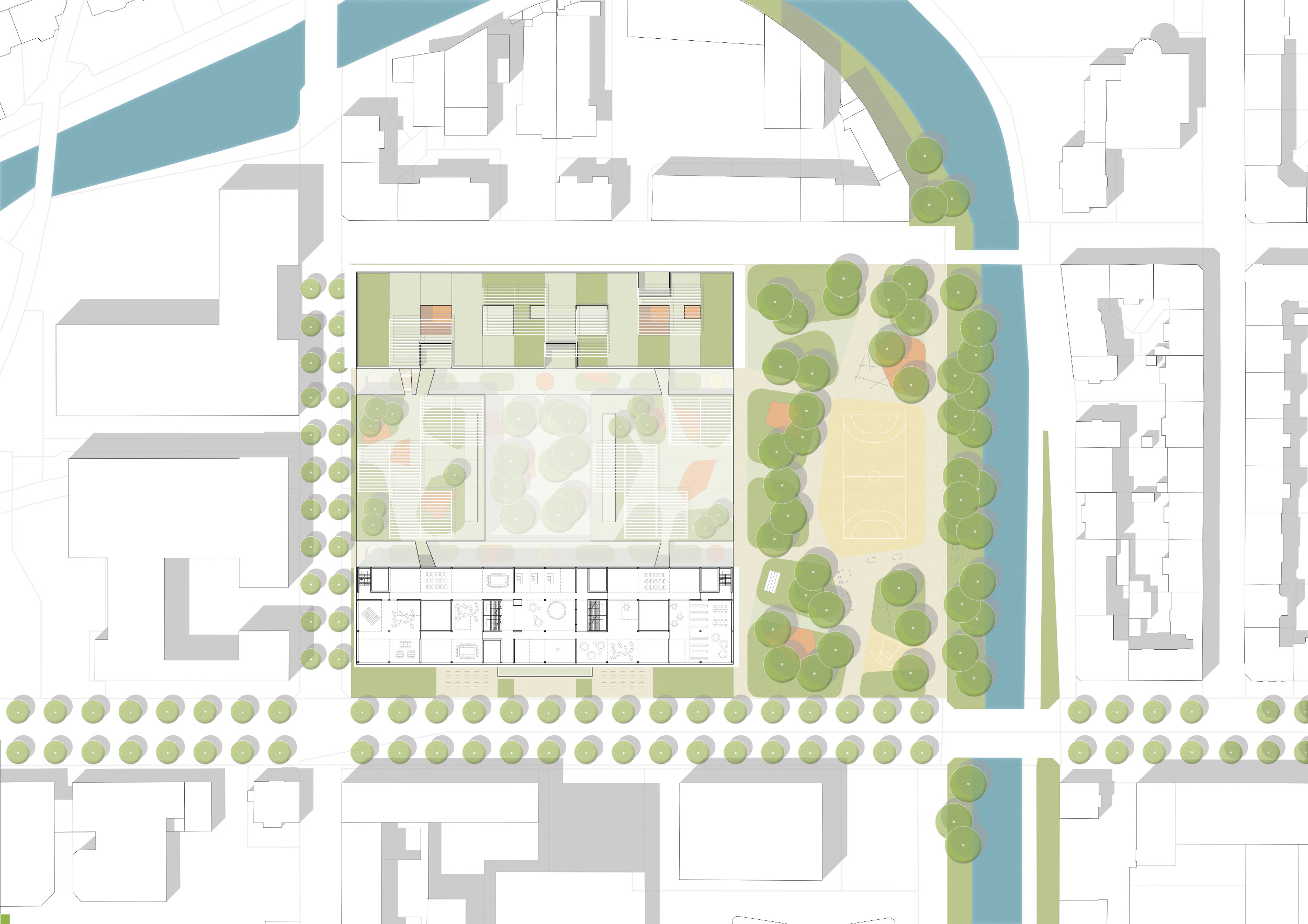 Unter den als Freifläche genutzten Dächern entsteht der neue Campus der internaIonalen Schule. Die städtebauliche Setzung der Baukörper ergänzt den städtischen Kontext in angemessenem Maßstab-