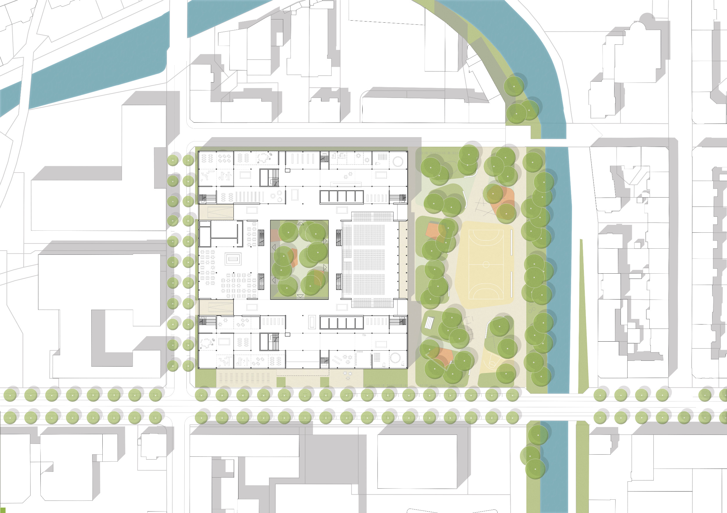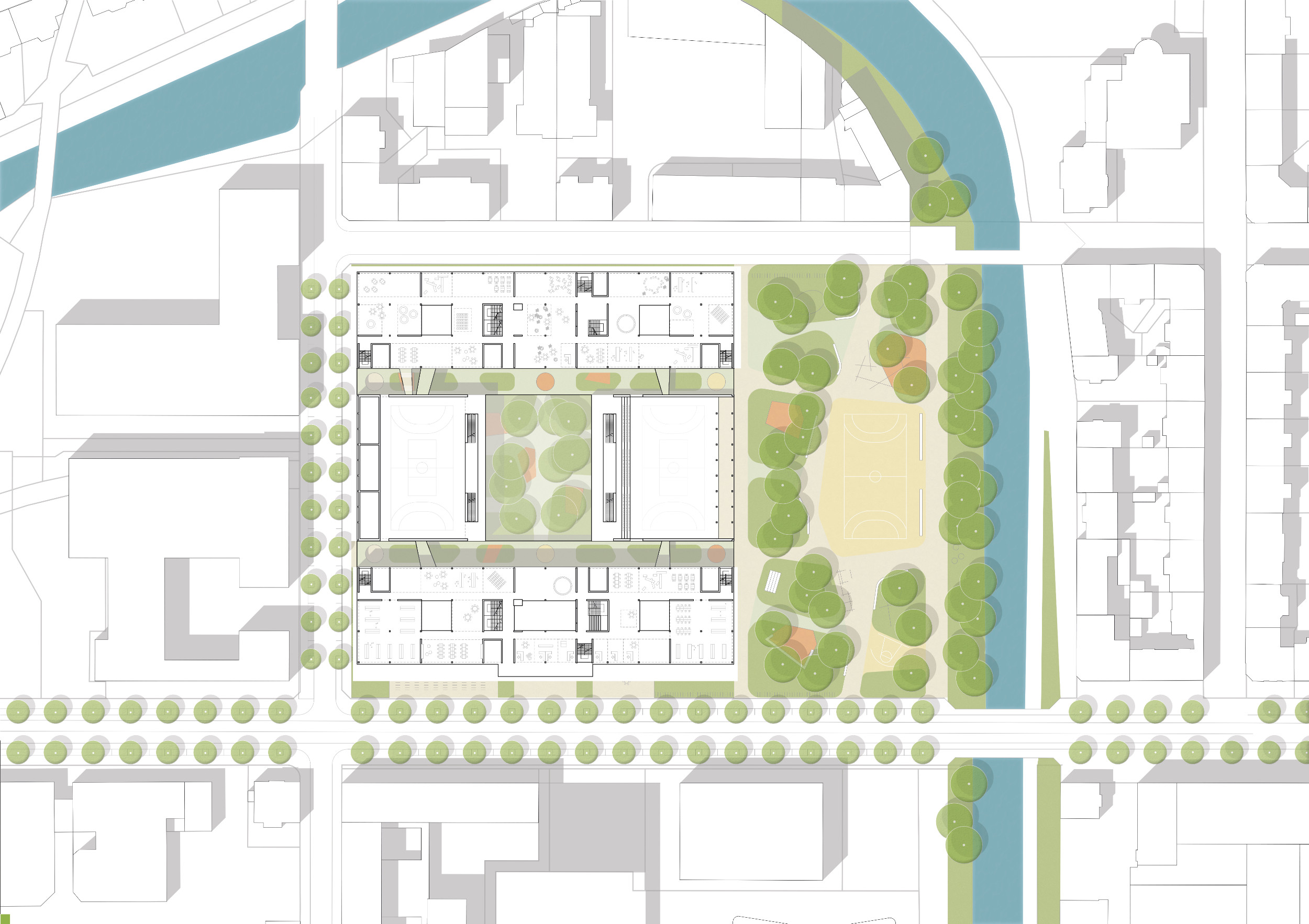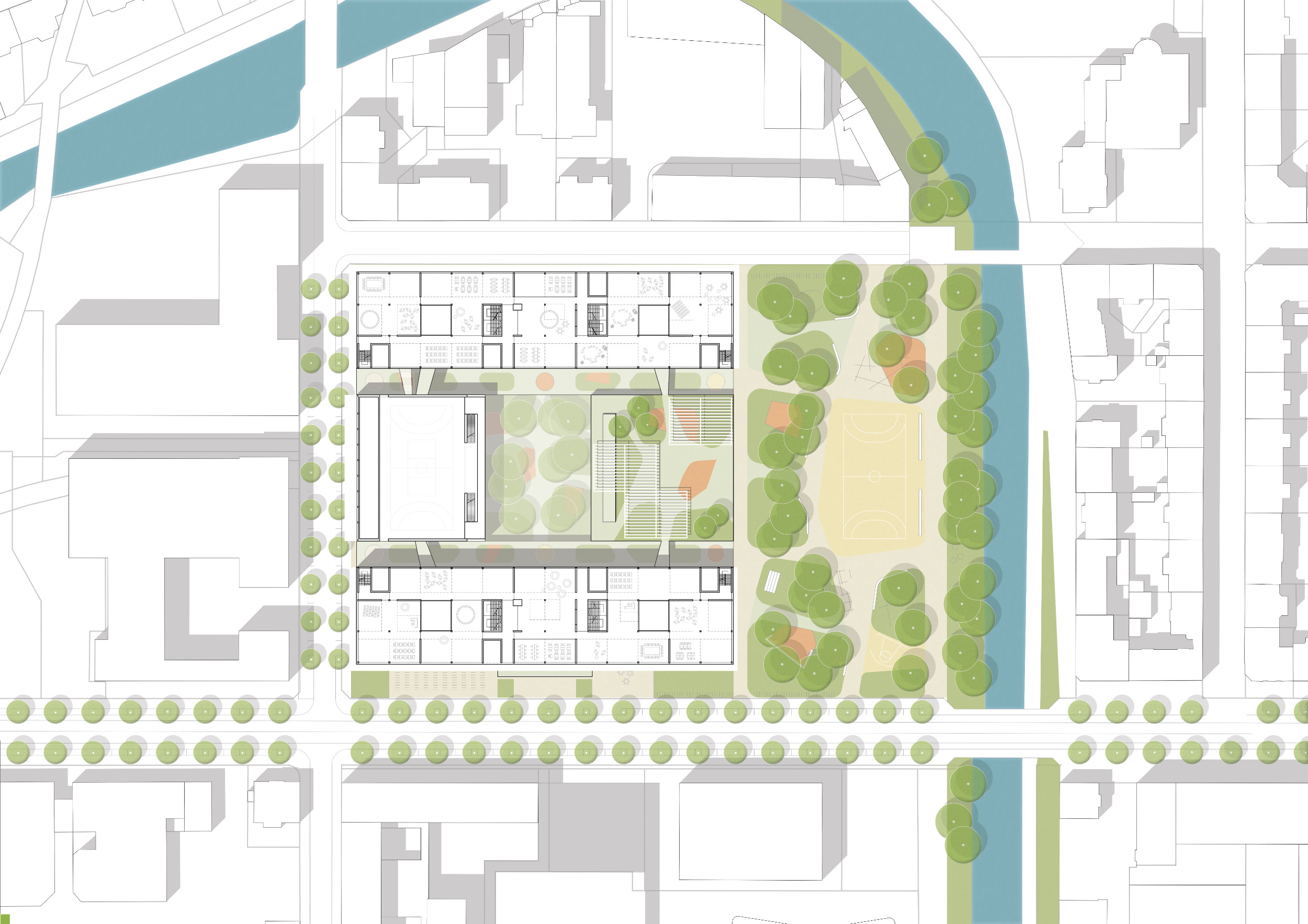 Unter den als Freifläche genutzten Dächern entsteht der neue Campus der internaIonalen Schule. Die städtebauliche Setzung der Baukörper ergänzt den städtischen Kontext in angemessenem Maßstab-