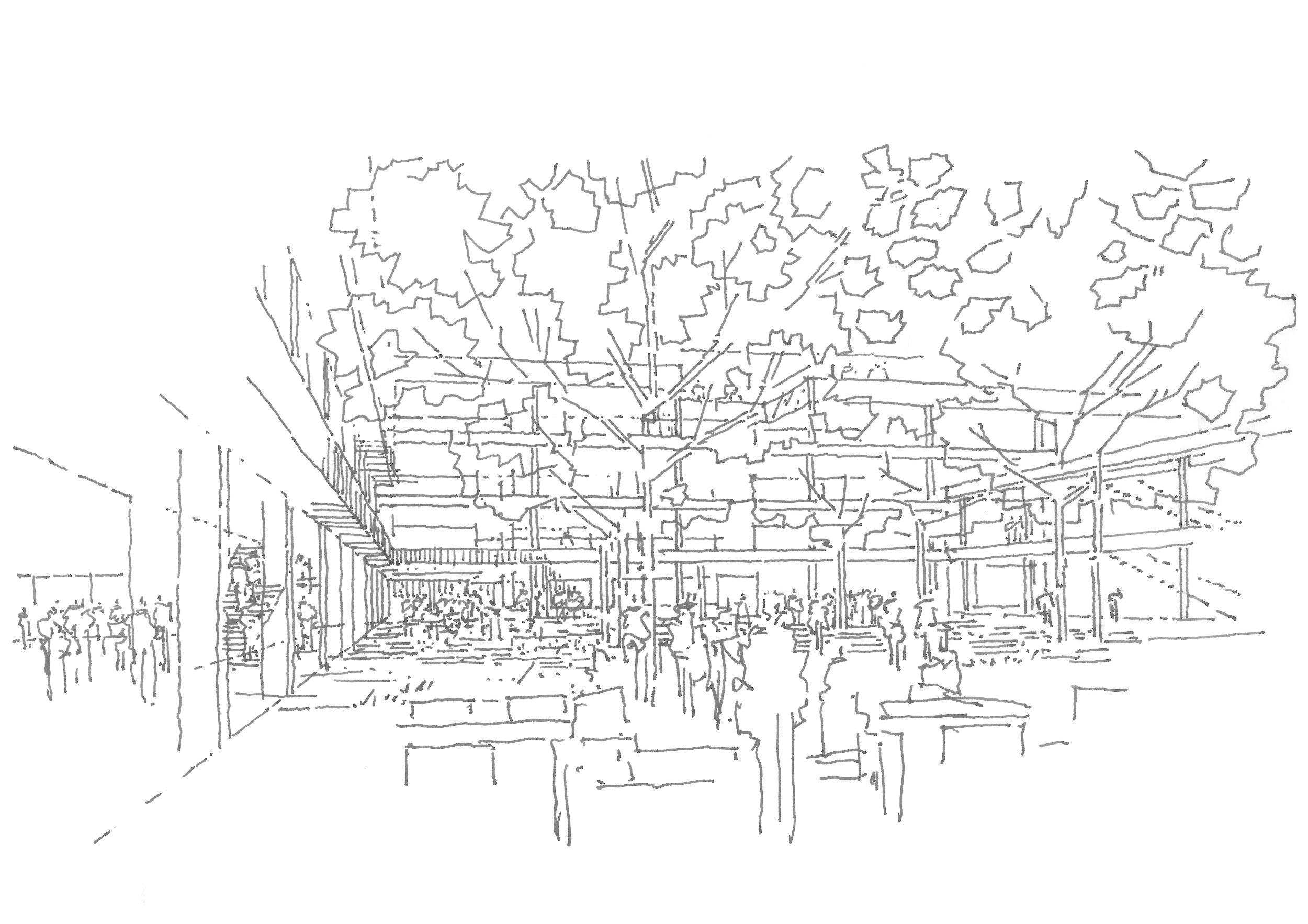 Das Herz des Campus ist ein zentraler, alle Schulfunktionen verbindender Gartenhof im Erdgeschoss. Alle gemeinschaflichen Funkionen der Schule sind räumlich mit dieser grünen Mitte verbunden. Ergänzt werden die Nutzungen des EG durch die kreativen und musischen Fachunterrichtsbereiche, die Bibliotheken und das Schüler*innencafé. Beide Schulen haben im Erdgeschoss einen mit dem öffentlichen Park verbunden Pausen- und Ausstellungsbereich.