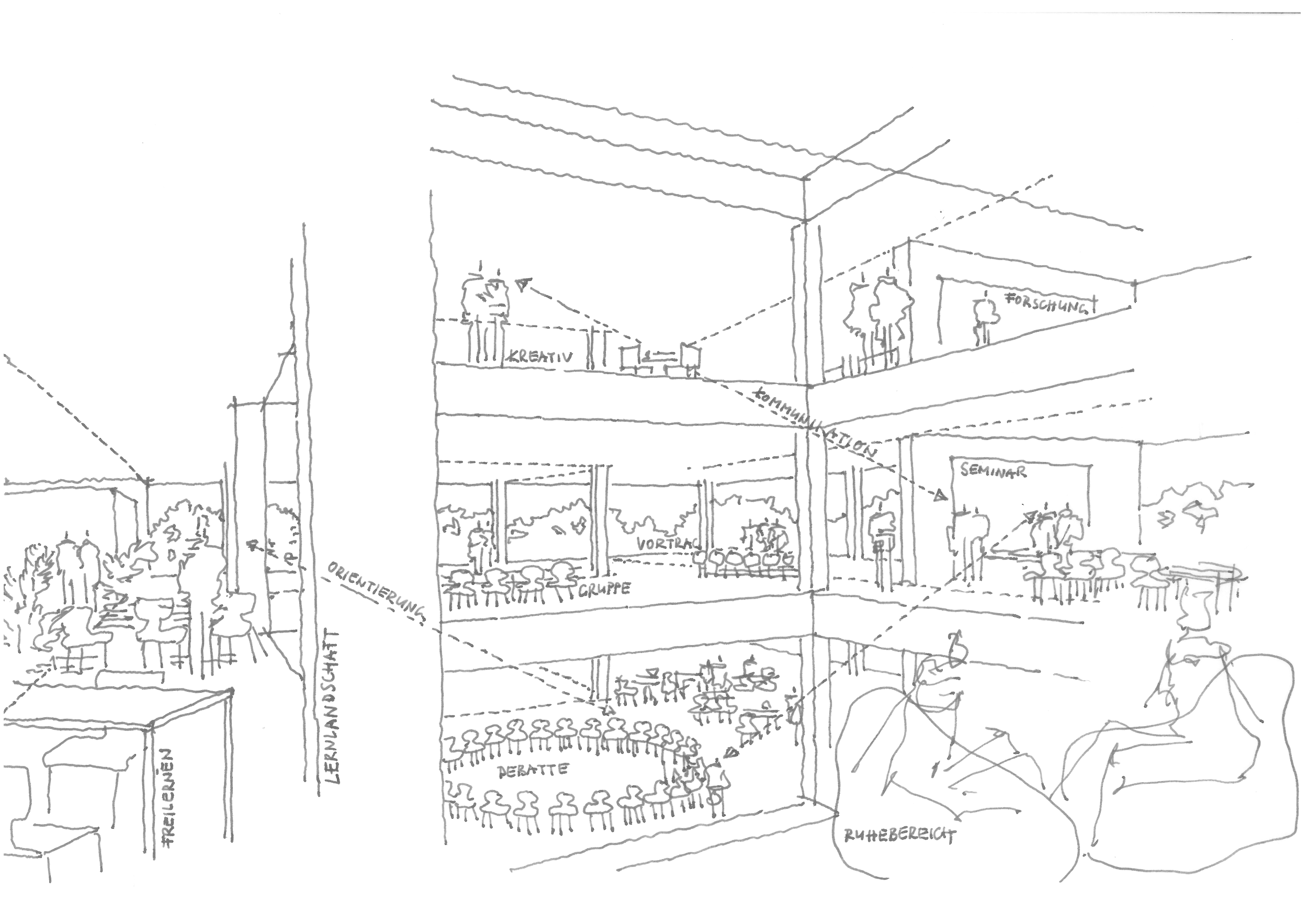 Die Ebenen der Schulen sind in Nutzungseinheiten von 400 m² gegliedert. Dies ermöglicht die organische Gestaltung von Lernlandschaften entsprechend der pädagogischen Anforderungen. Alle Ebenen des Campus sind unmittelbar mit den Schulfreifächen verknüpft.