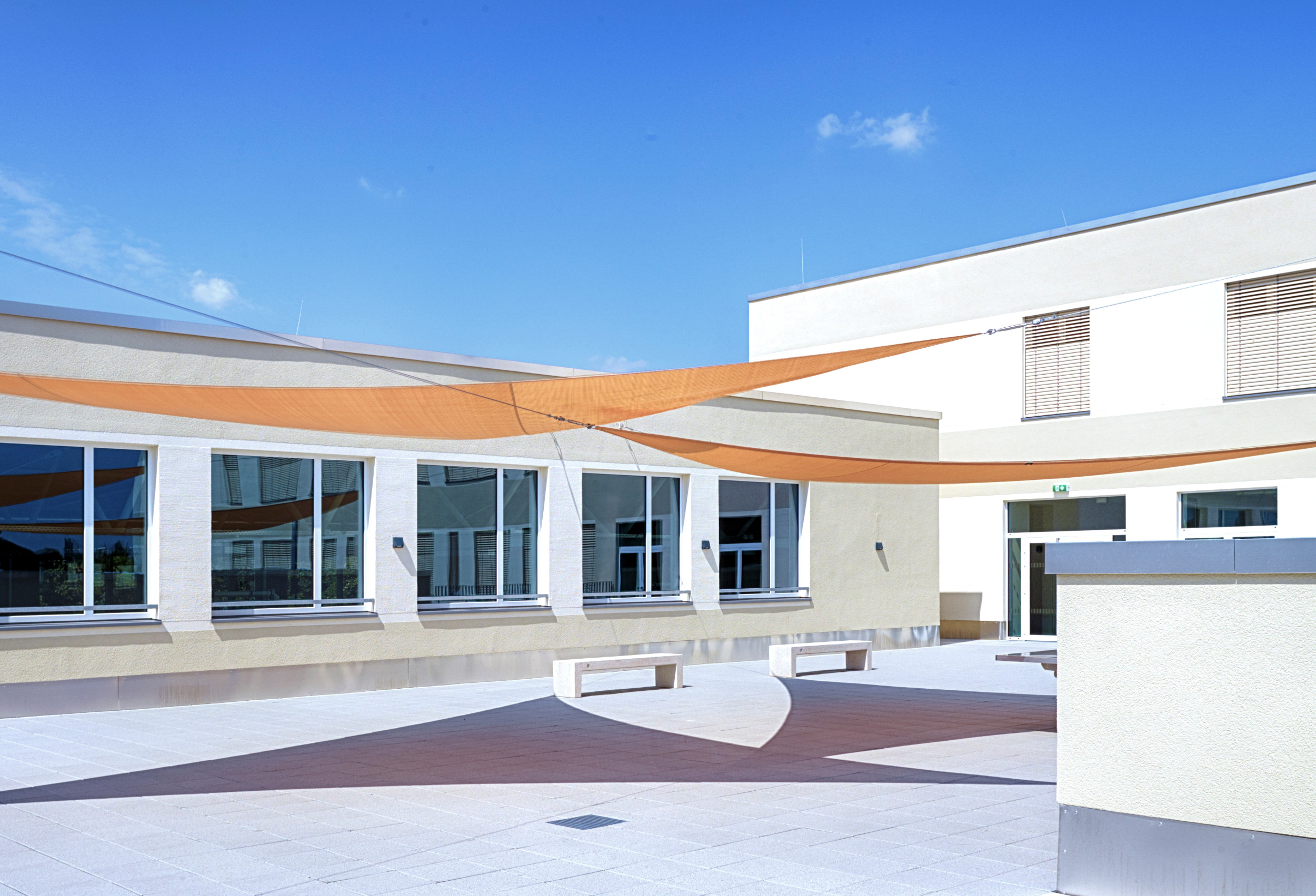 Die Freiflächen sind den Schulen zugeordnet, die Sportflächen können gemeinsam genutzt werden. Ein kleiner Vorplatz an der Richard-Wagner-Straße fungiert als Treffpunkt, während der wettergeschützte Eingangsbereich einladend in die Schule führt. Farbliche Details an den Fassaden machen die verschiedenen Bereiche von außen ablesbar, und die Oberflächen der Pausenbereiche sind mit Sonnensegeln überdacht. Die Wand des Geräteraums kann als Boulderwand genutzt oder gemeinsam mit den Schüler*innen gestaltet werden.