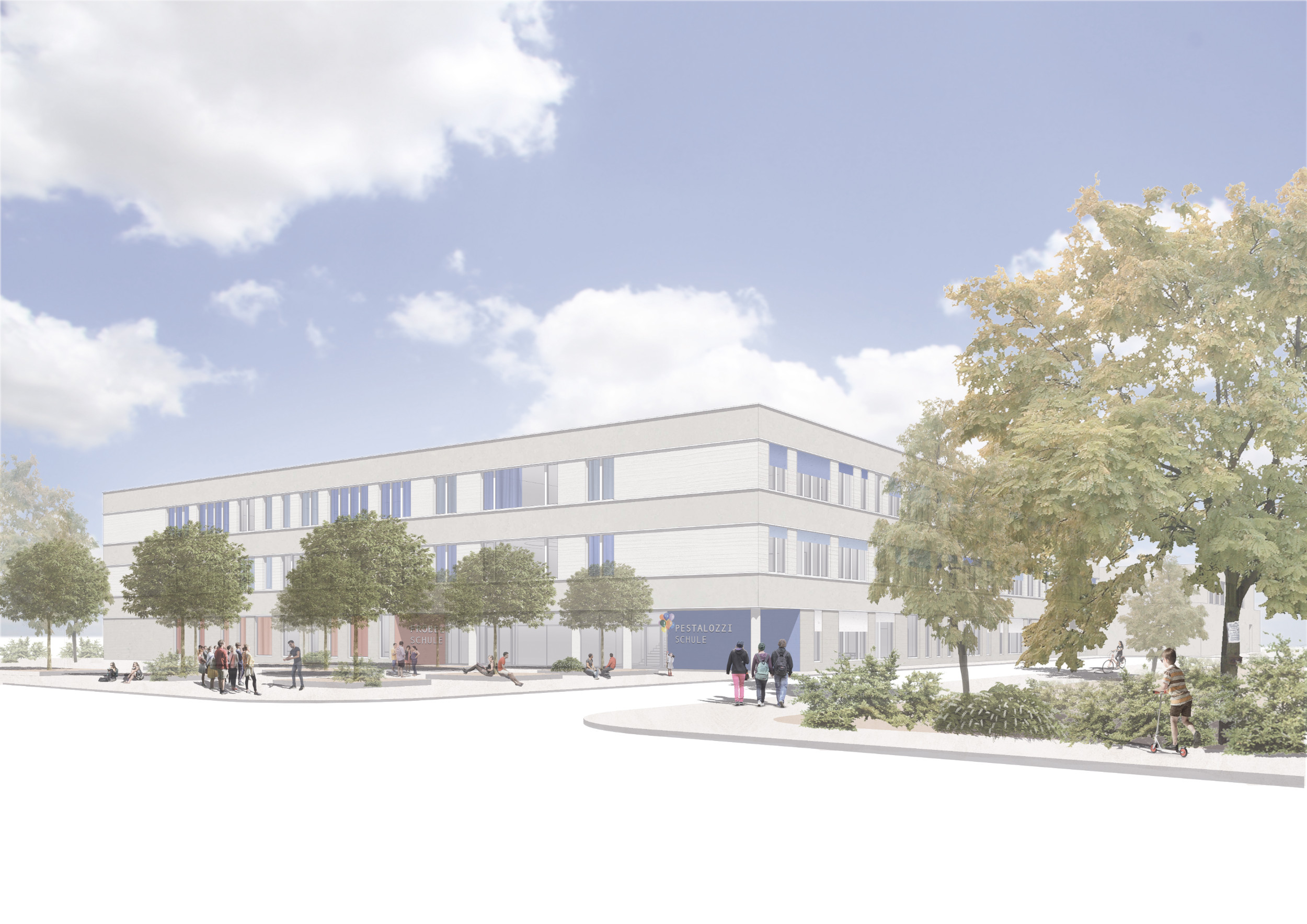Die Pestalozzischule legt den Schwerpunkt auf Lernförderung und bietet ruhige, reizarme Räume in den beiden oberen Geschossen. Die Unterrichtsräume für Unter- und Oberstufe sind jeweils auf einer eigenen Ebene angeordnet. Für die Pestalozzischüler*innen steht zudem ein oberer Pausenhof direkt am Hortbereich zur Verfügung.