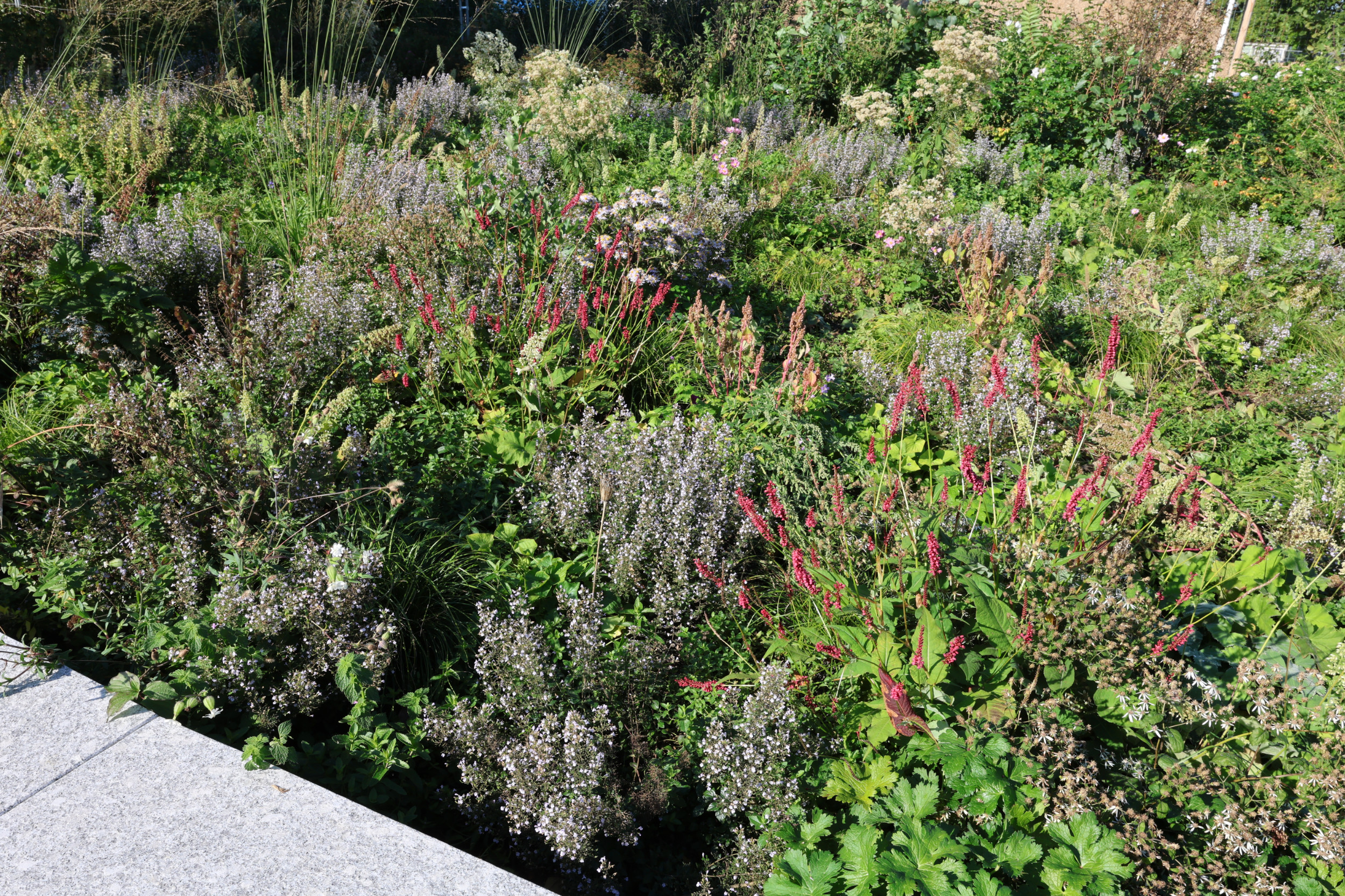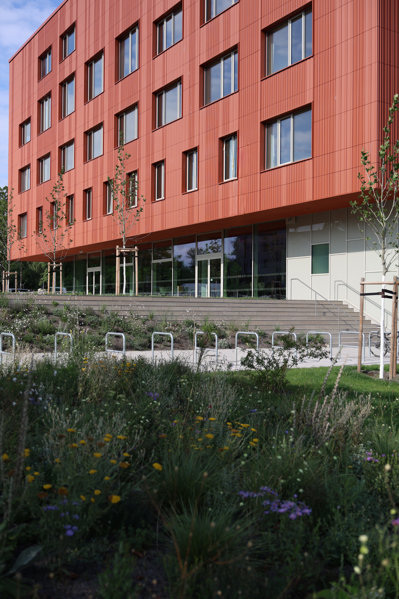 Das gesamte Regenwasser wird auf dem Grundstück zurückgehalten. Die blau-grünen Dächer sind als Retentionsdächer ausgebildet, auf denen das Wasser gesammelt und zeitverzögert abgegeben wird. Ein Teil dient der Bewässerung der Baumstandorte, bevor es schließlich in einer Rigolenanlage versickert. So entsteht ein nachhaltiger Wasserkreislauf, der das Gelände auch in trockenen Zeiten versorgt und entlastet. Die Anlage folgt dem Prinzip der Schwammstadt: Das Gelände nimmt Wasser auf, speichert es und gibt es in trockenen Zeiten wieder frei. So entsteht ein ausgeglichenes Mikroklima, das die Umgebung spürbar abkühlt und den Aufenthalt im Freien angenehmer macht. Die vielfältige Bepflanzung schafft Lebensräume für Insekten, Vögel und andere kleine Tiere und trägt zu einer wachsenden Artenvielfalt im schulischen Umfeld bei. Auf den Dachflächen unterstützen Photovoltaikmodule zusätzlich die Energiegewinnung vor Ort und machen den Campus nicht nur ökologisch widerstandsfähiger, sondern auch energetisch unabhängiger.