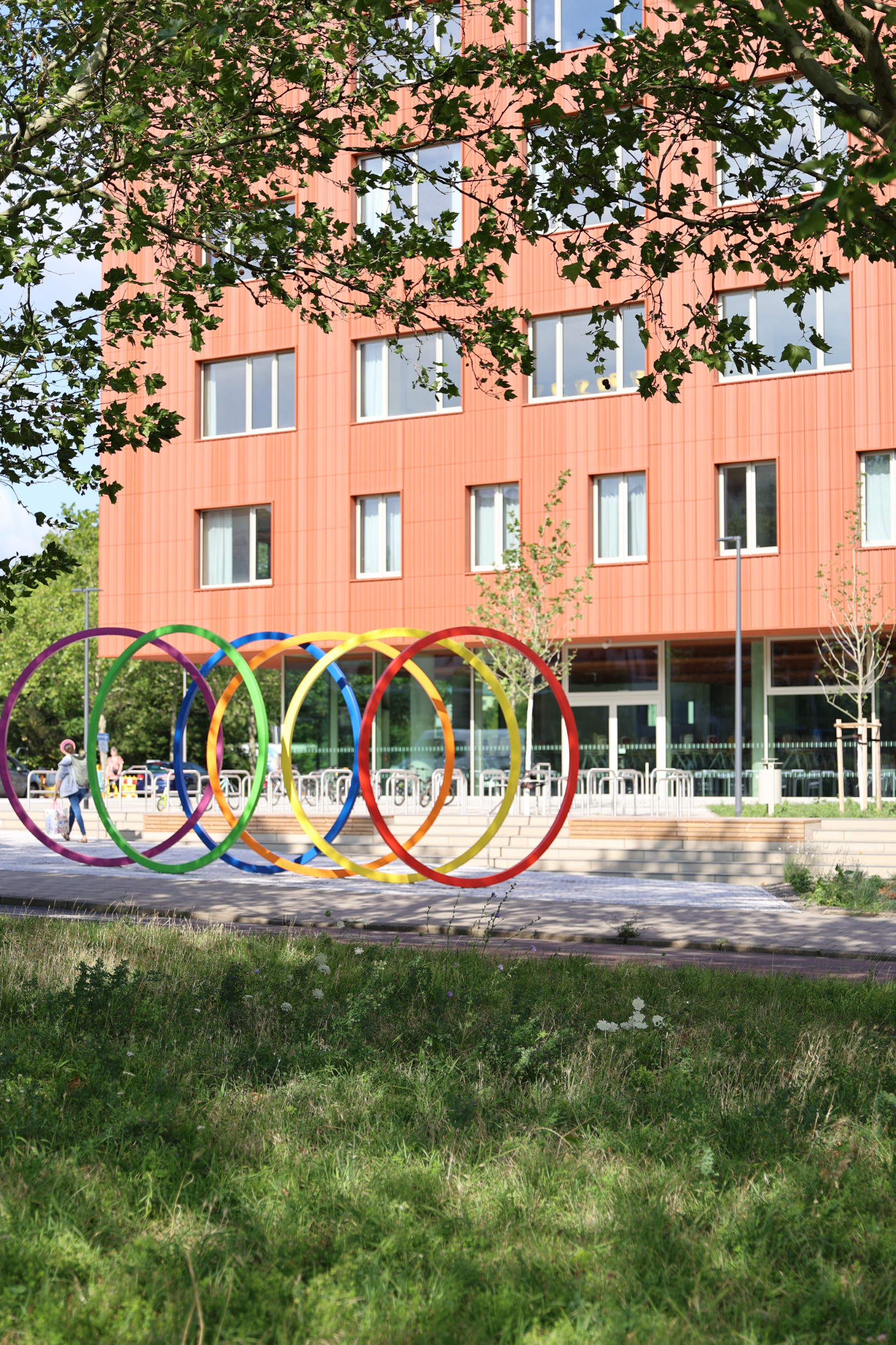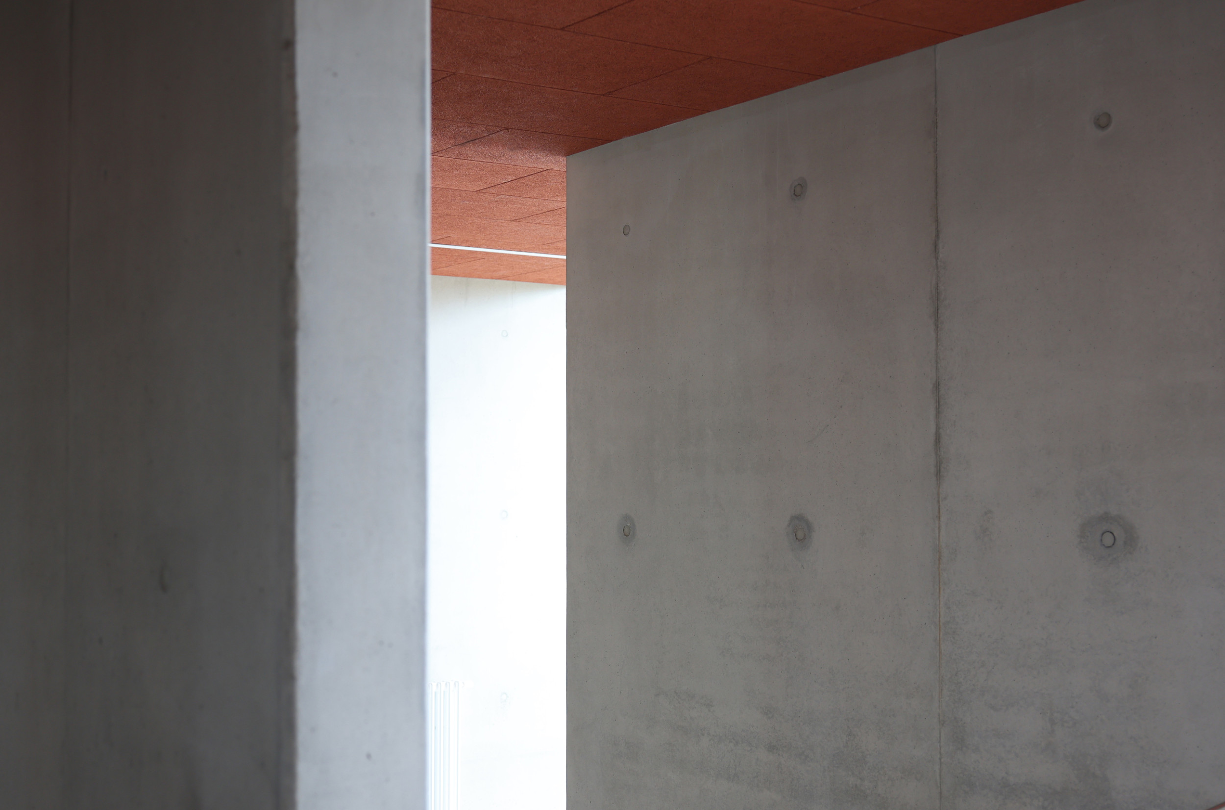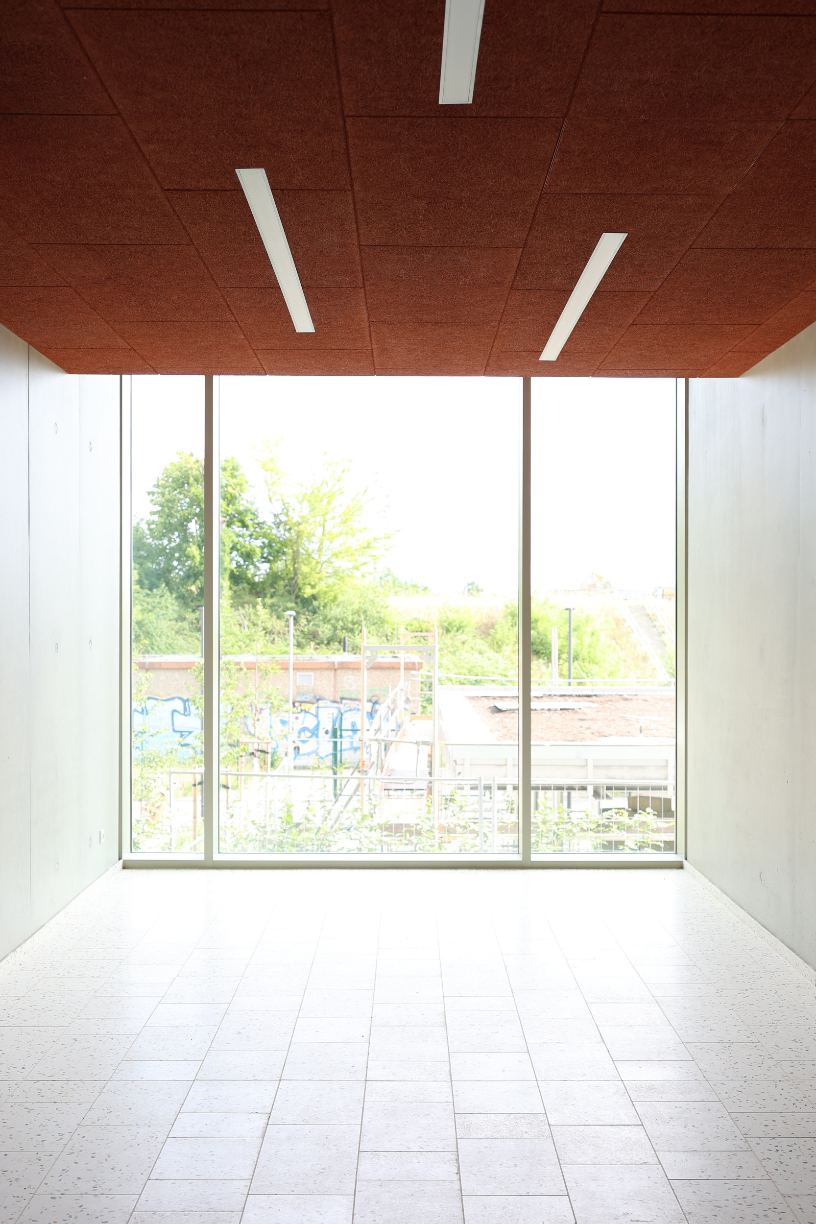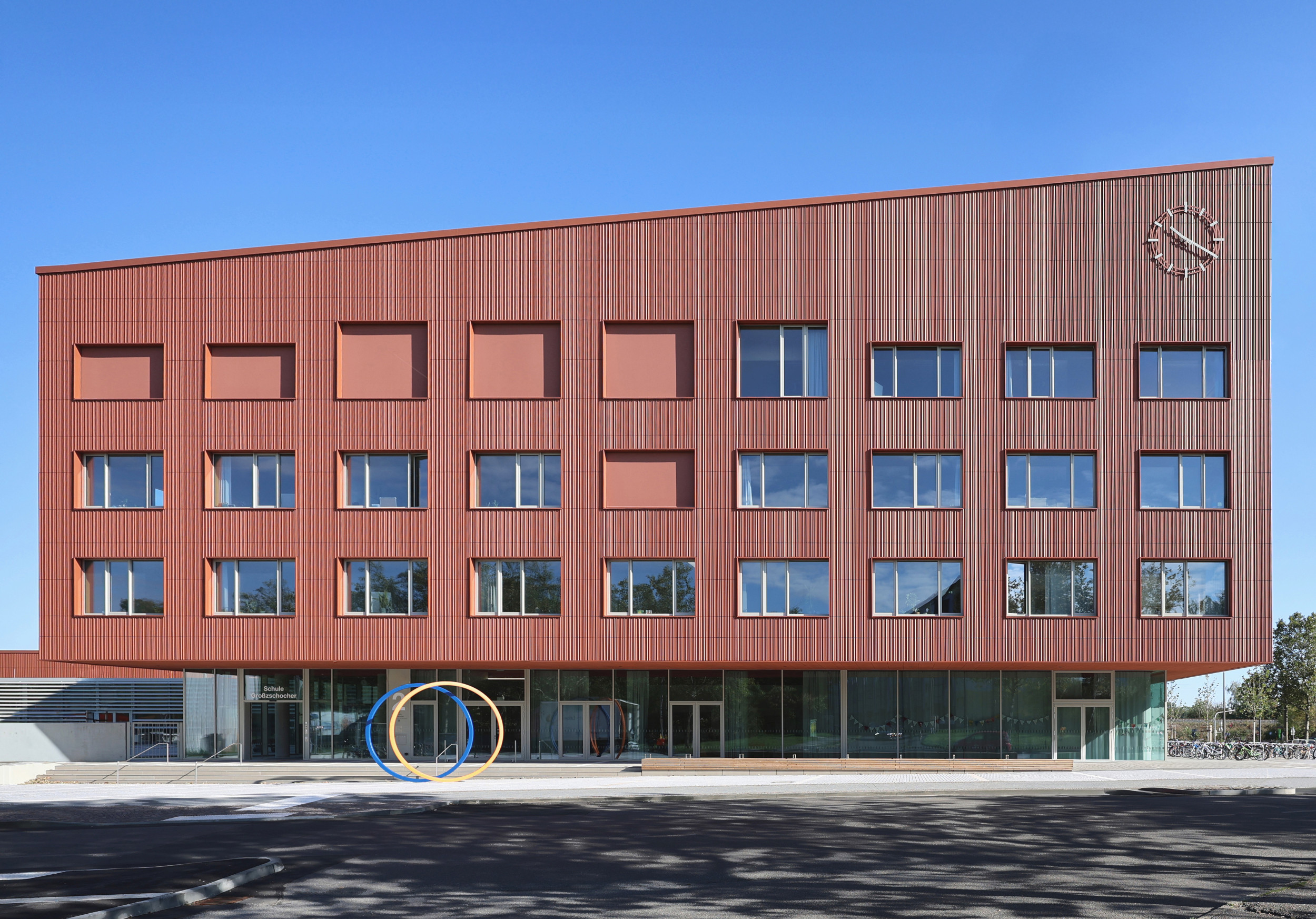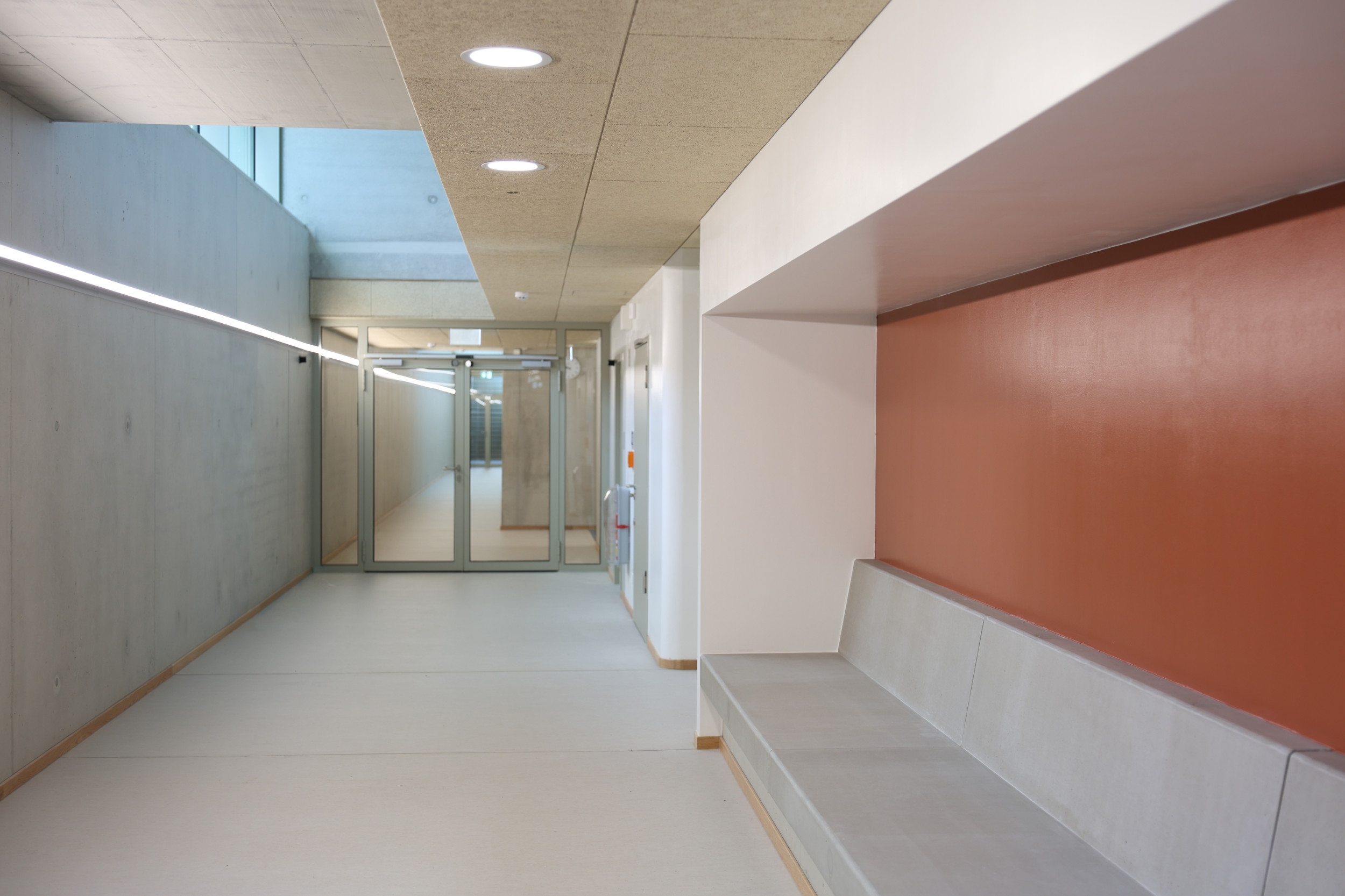 Innerhalb dieses heterogenen Kontextes nimmt die neue Schule in Höhe und Ausrichtung den Dialog mit dem Umfeld auf. Der schwebende rote Baukörper ist prägnant, freundlich und bietet im städtischen Raum Orientierung.