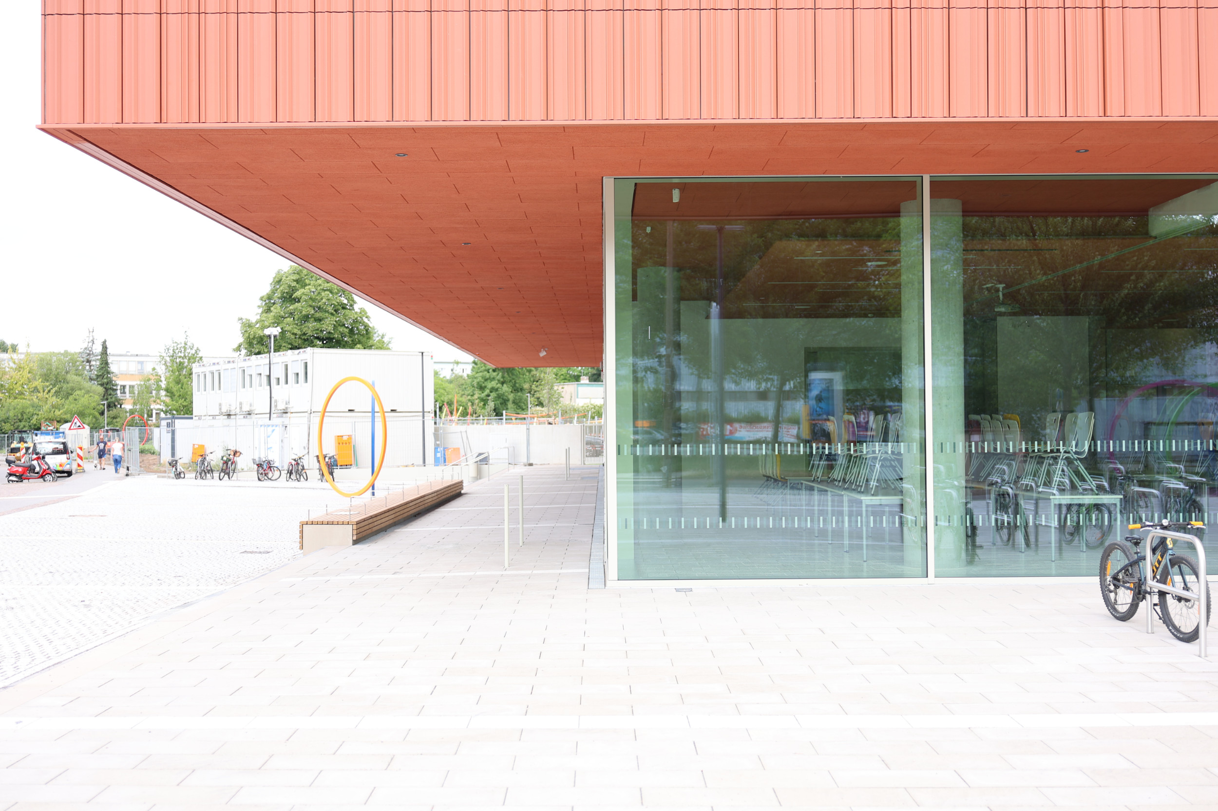 Schule und Sporthalle geben dem nach Südwesten orientierten Schulhof Schutz und eine klare räumliche Fassung. Dieser Hof bildet zugleich den ersten Baustein der gemeinsamen Mitte des gesamten Bildungscampus. Die neu gepflanzten Bäume spenden von Jahr zu Jahr mehr Schatten, und ihre Arten sind so gewählt, dass sie den klimatischen Herausforderungen unserer Zeit standhalten – widerstandsfähig gegenüber Hitze, extremen Wetterlagen und langen Trockenperioden.