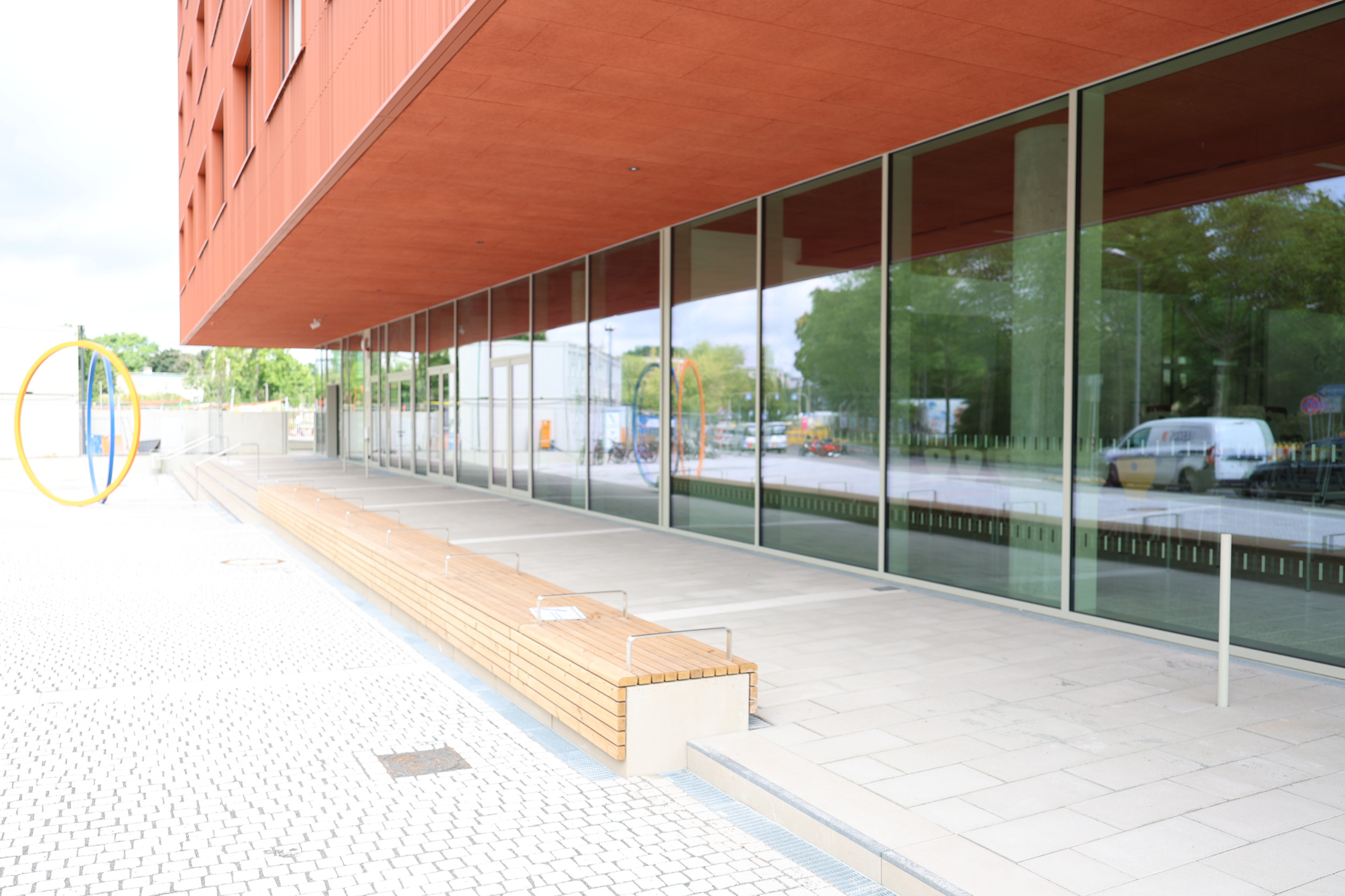 Mit dem neu gestalteten Umfeld öffnet sich die Schule zum Wohnquartier und bietet über die schulische Nutzung hinaus Angebote für die Bewohner des Stadtteiles. Bänke zum Verweilen, Sitzstufen zum informellen Treffen, ein Spielplatz für die Kleinen und Sportgeräte für die Großen laden ein genutzt zu werden.