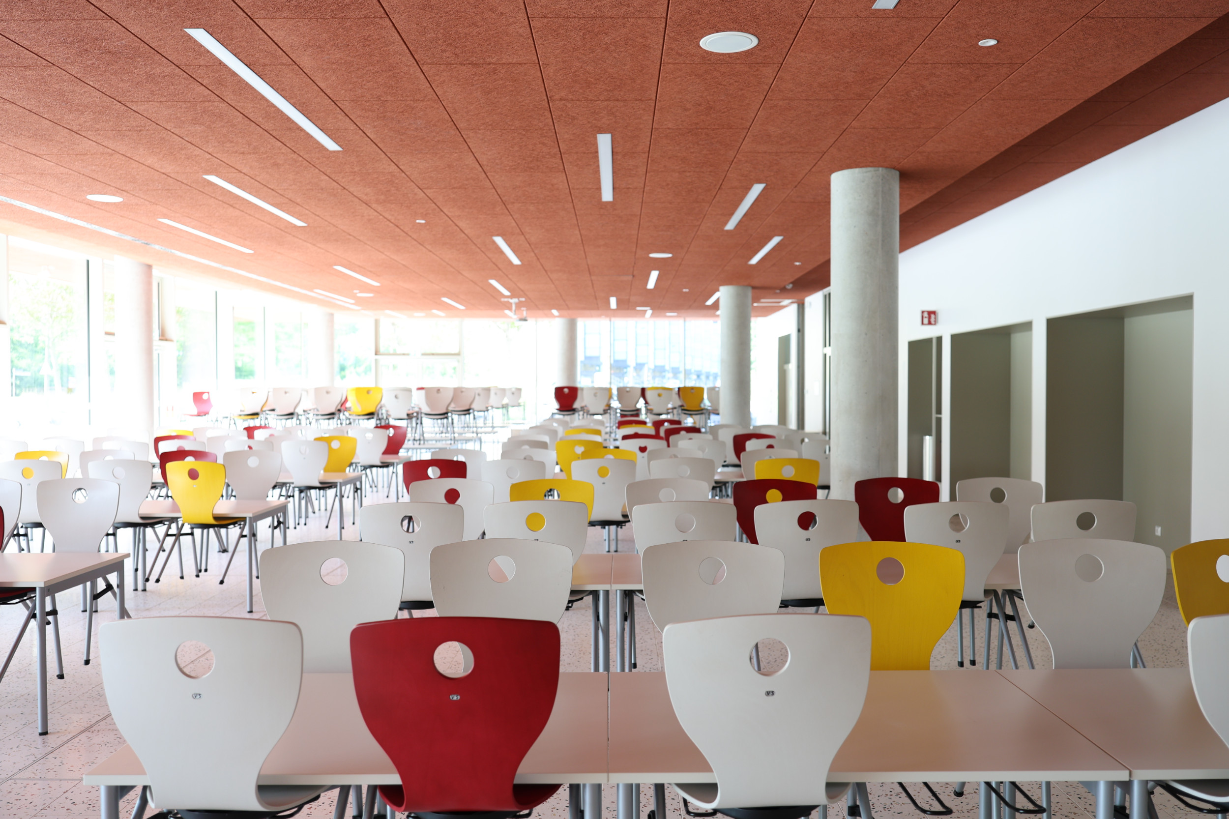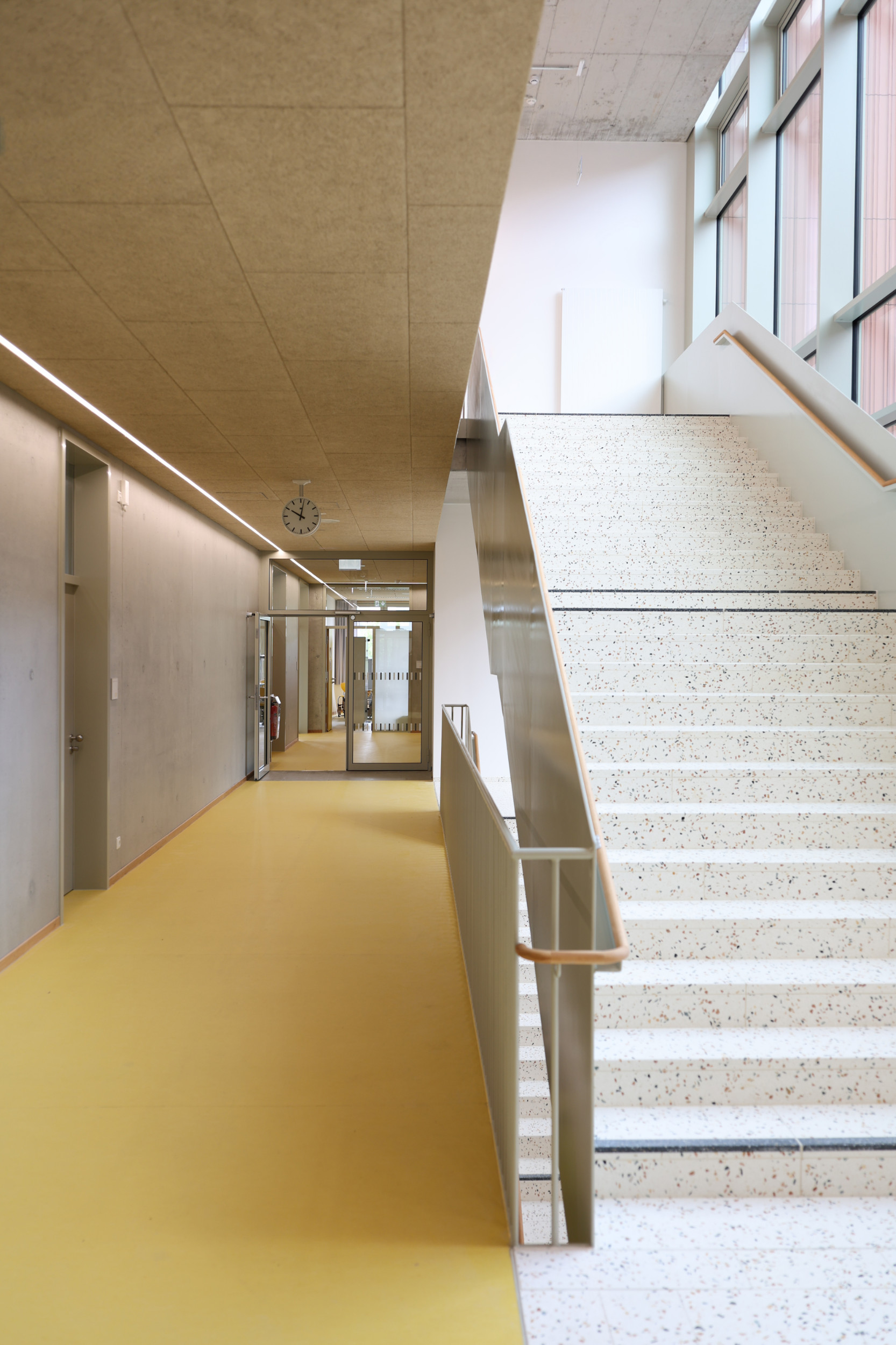 Zur Schule gehört ebenso eine Dreifeldsporthalle, die außerhalb der schulischen Nutzungszeiten den Sportvereinen der Umgebung offensteht. Sie erweitert das Angebot der Schule und schafft zugleich einen Ort, an dem sich Bildung und gesellschaftliches Leben begegnen. Dass das gesamte Gebäude barrierefrei gestaltet ist, versteht sich von selbst – jeder Bereich ist für alle Kinder und Besucher gleichermaßen zugänglich.