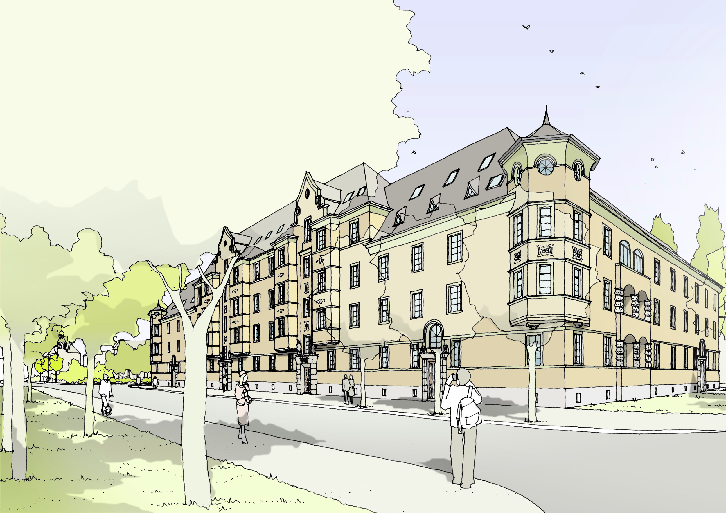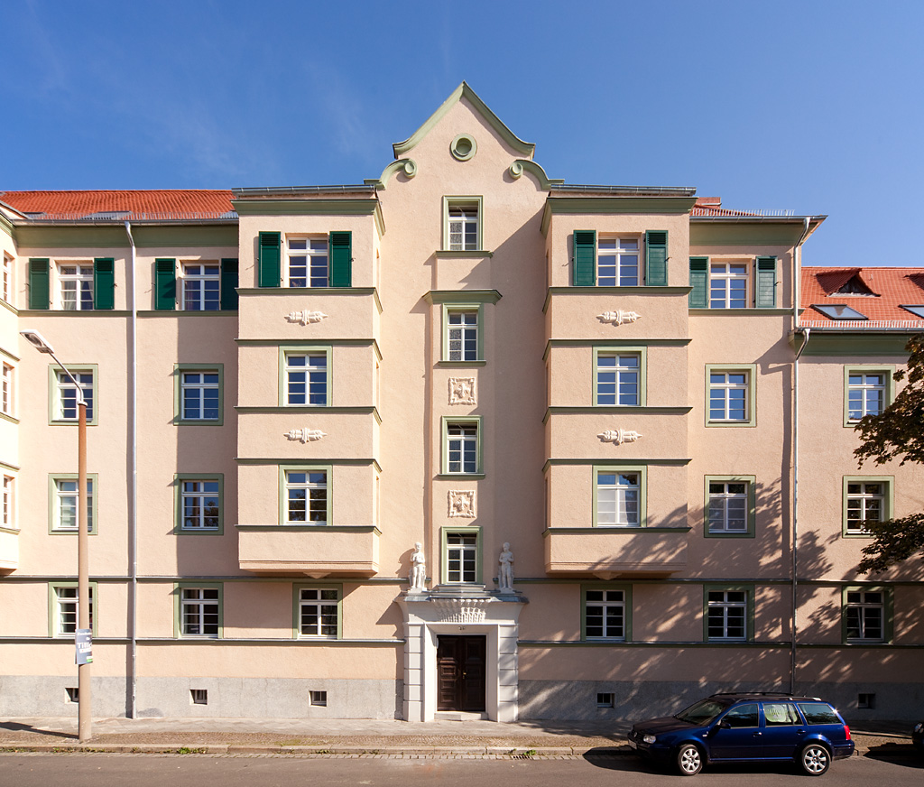 Der U-förmige Baukörper bildet mit seinem Pendant an der Sattelhofstraße beinahe ein fast perfektes Quadrat. Zwischen beiden Bauköpern verläuft eine halbhöffentlicher, von Pyramidenpappeln und Rosskastanien gesäumter Erschließungsweg, der in der Mitte zu einem Spielplatz führt. Die straßenseitige Fassade weist eine zeittypische, symetrisch gegliederte Putzfassade auf die durch Erker und Loggien betont wird.