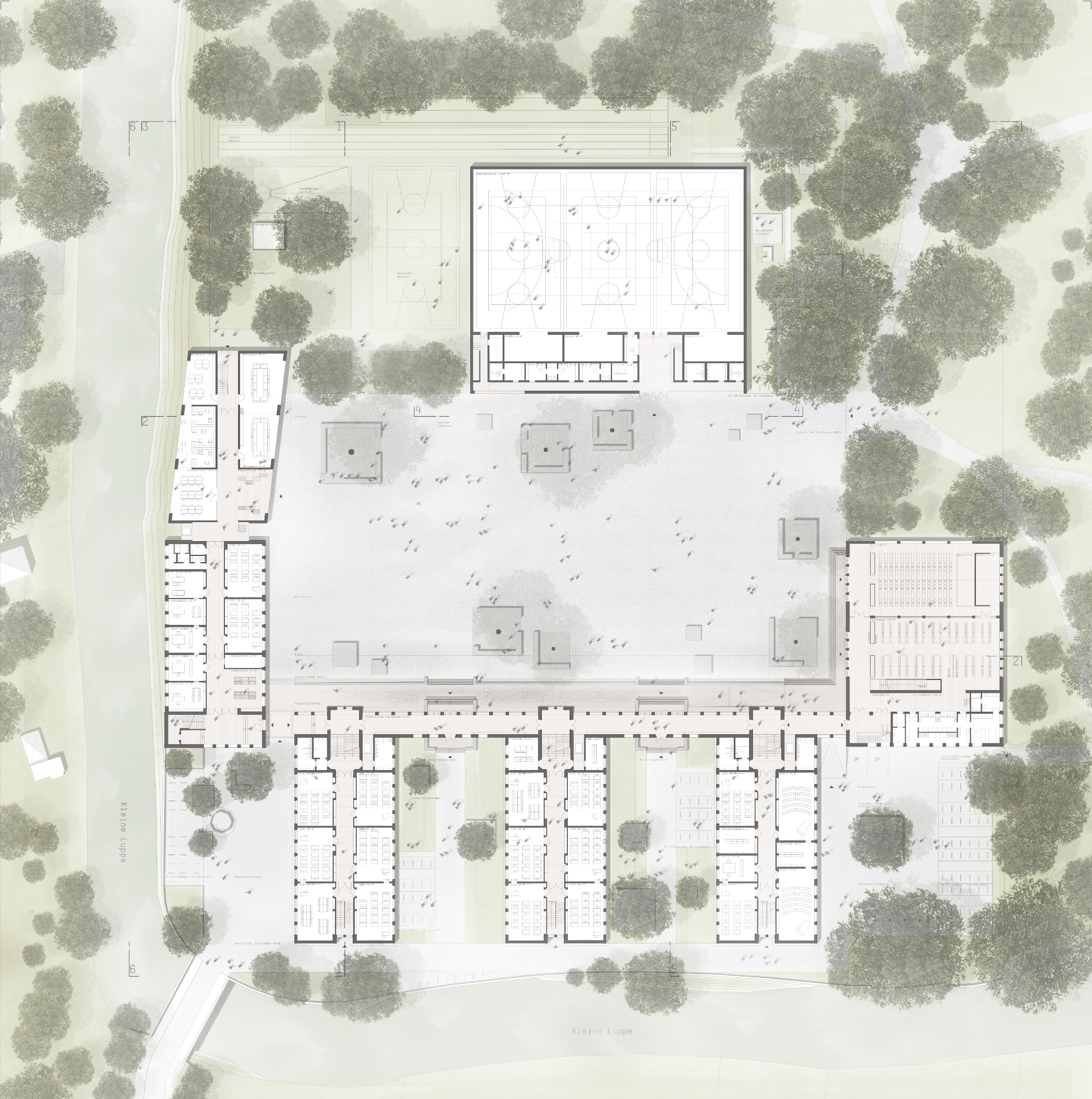 Die gesamte Schulanlage wird in den Landschaftsraum des Palmengartens eingebettet, was die besondere Qualität des Ortes ausmacht. Die Orientierung zu Bäumen, Wasser und Licht wird im Entwurf fortgeführt, um die naturnahe Leichtigkeit eines „locus amoenus“ – eines angenehmen und gesunden Lernorts – zu vermitteln.
