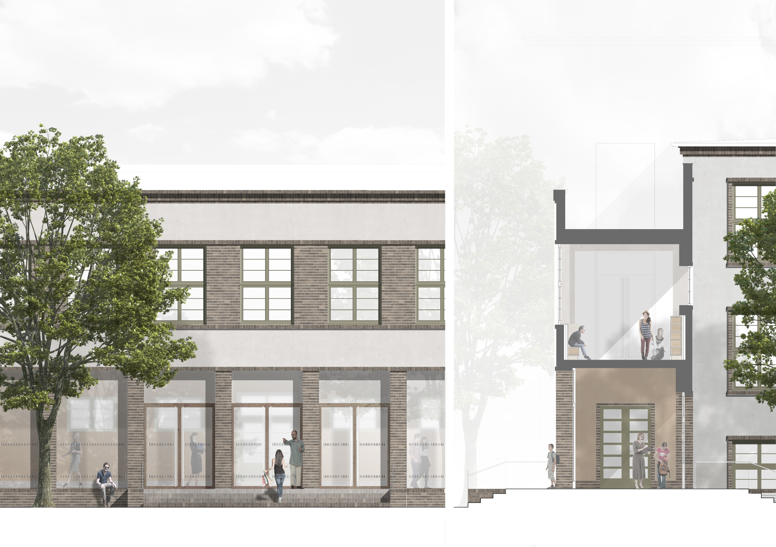 Der Laubengang wird verglast und dient als wettergeschützte Pausenfläche, zugänglich von Hof und Gebäuden. Die Verglasungsprofile werden hinter bestehenden Pfeilern verborgen, sodass sie von außen nicht sichtbar sind. In der historischen Turnhalle (Haus E) werden Einbauten entfernt, um einen großzügigen, hellen Raum zu schaffen, verbunden durch eine einläufige Treppe mit dem 1. Obergeschoss. Ein langgezogener Fensterschlitz an der Aula ermöglicht Ein- und Ausblicke in den Palmengarten.