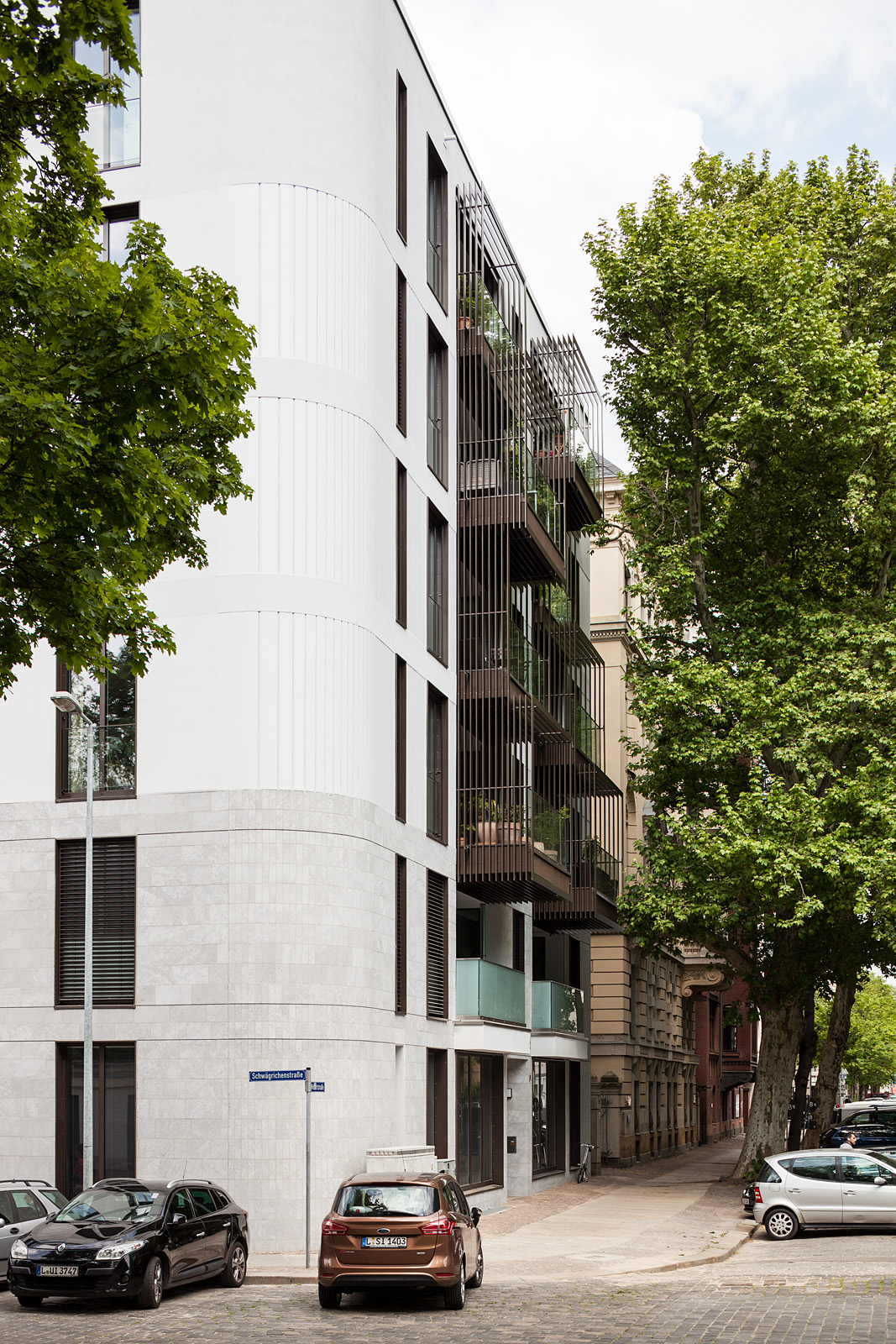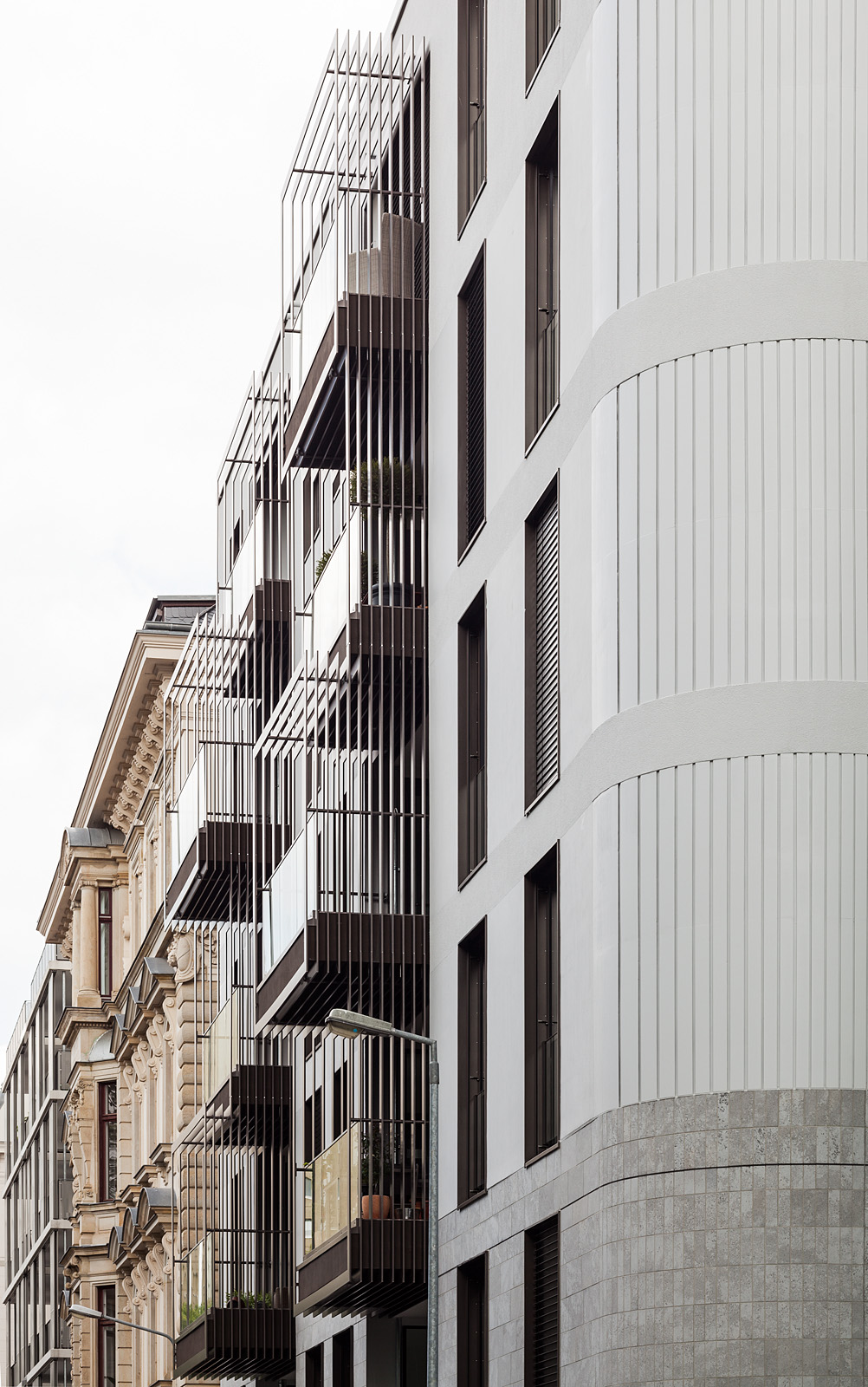 Auch in der Vertikalen wurde ein klares Raster eingeführt. Als identitätsstiftender Blickfang werden die Balkone von umlaufenden Lamellen-Rahmen in "Baubronze" (Kupfer-Zink-Legierung) gefasst. Diese reichen über vier Geschosse und bilden gestaltprägende Vor- und Rücksprünge. Zum einen lockern die vorgesetzten Elemente die ansonsten rigide Fassadeneinteilung räumlich auf. Gleichzeitig entstehen zusätzlich abwechslungsreiche Muster aus Licht und Schatten.