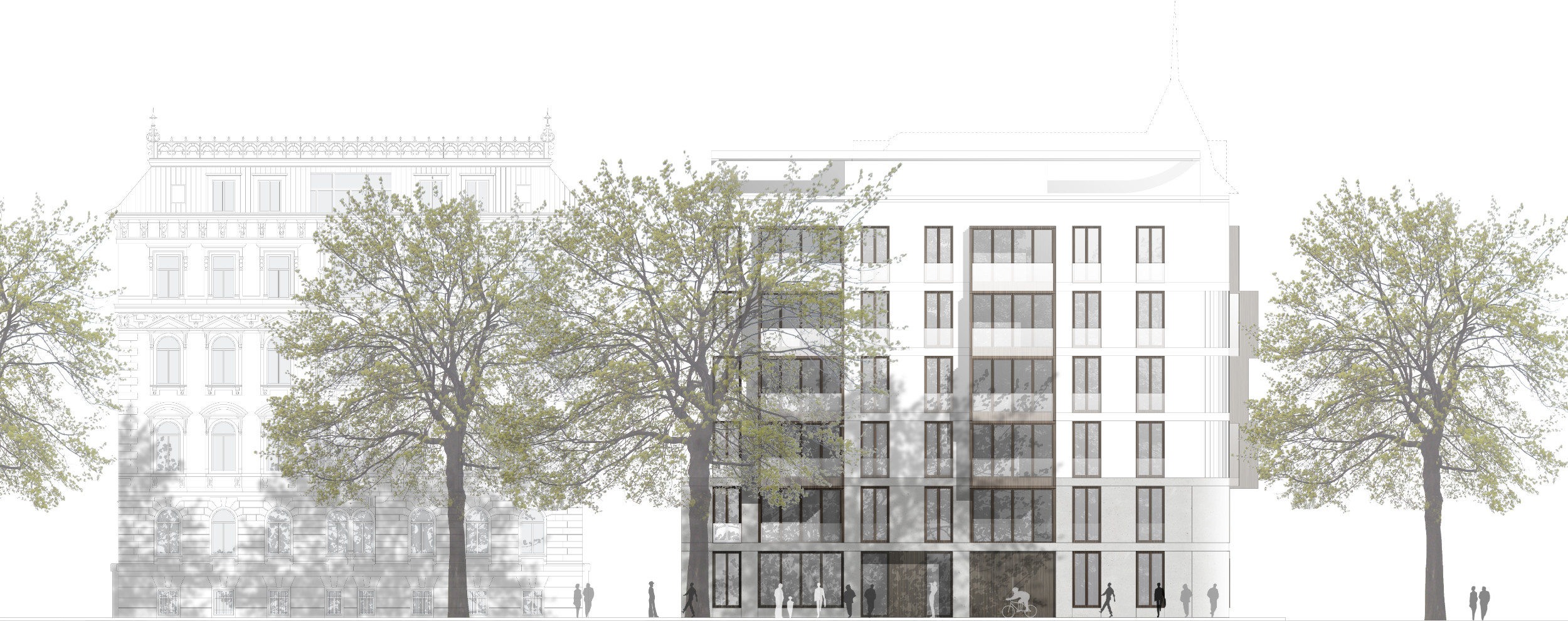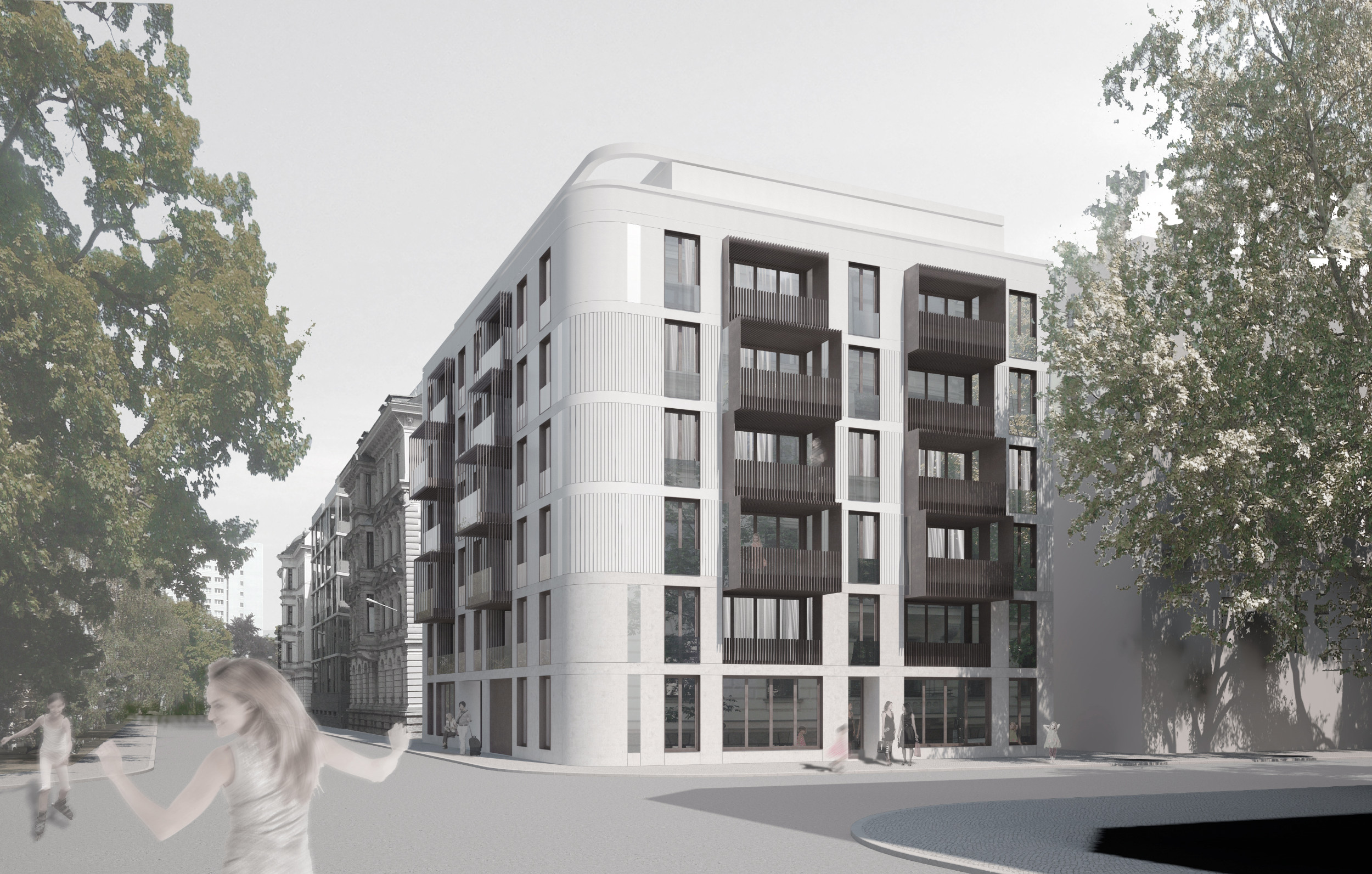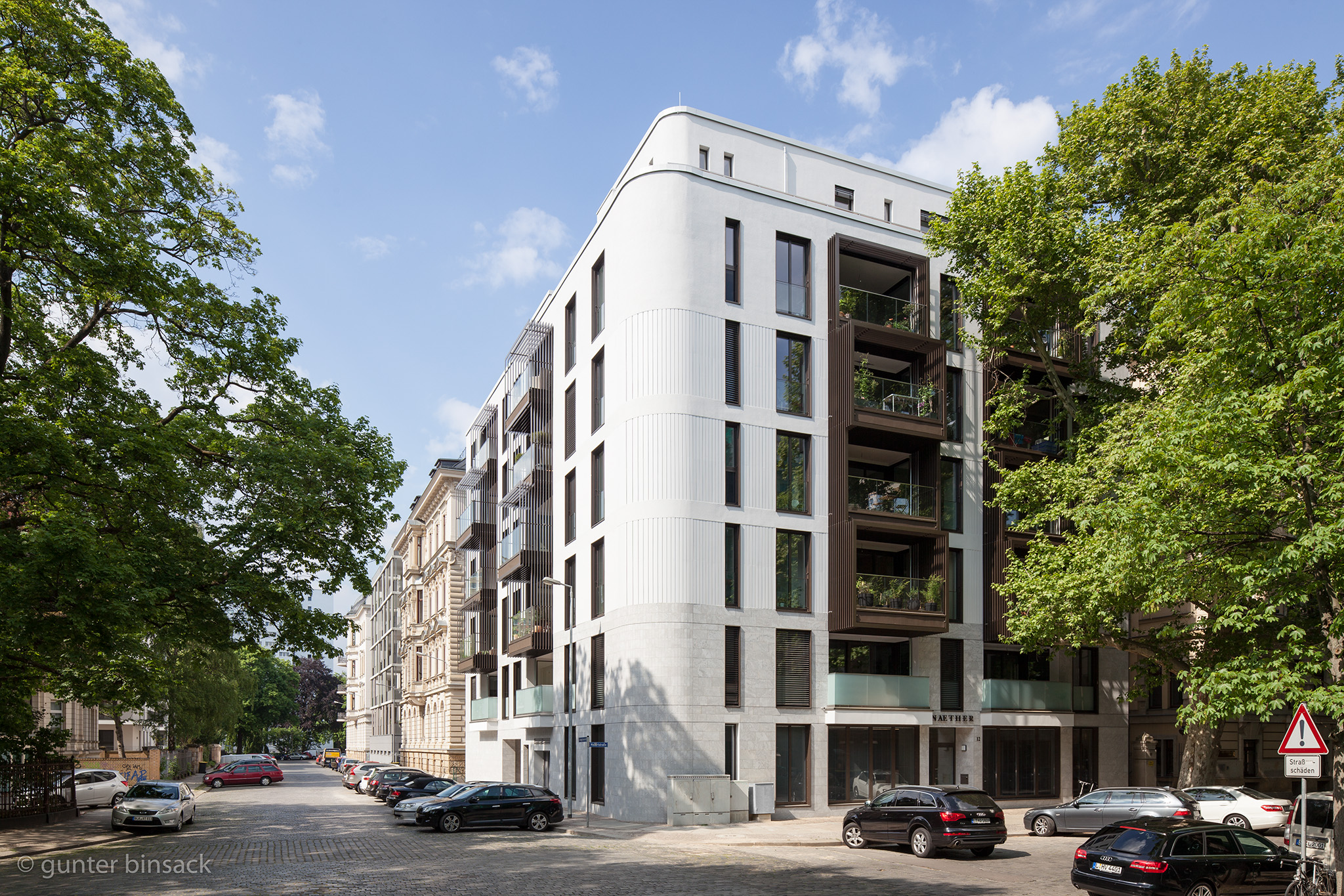 Der Neubau schließt die vorhandene Blockrandbebauung des innerstädtischen Straßenzugs nahe dem Johannapark in der West-Vorstadt. Zusammen mit seinem historischen Pendant gegenüber bildet das Haus den Auftakt zum Musikviertel mit zahlreichen kulturellen Einrichtungen. In Anlehnung an die umgebende Architektur ist die Fassade horizontal dreiteilig in Sockelzone, Hauptetagen und das Attikageschoss gegliedert.