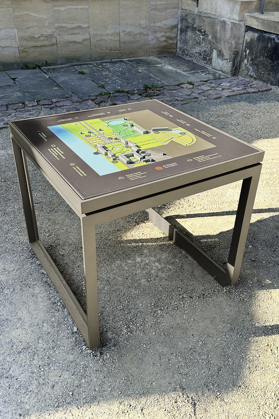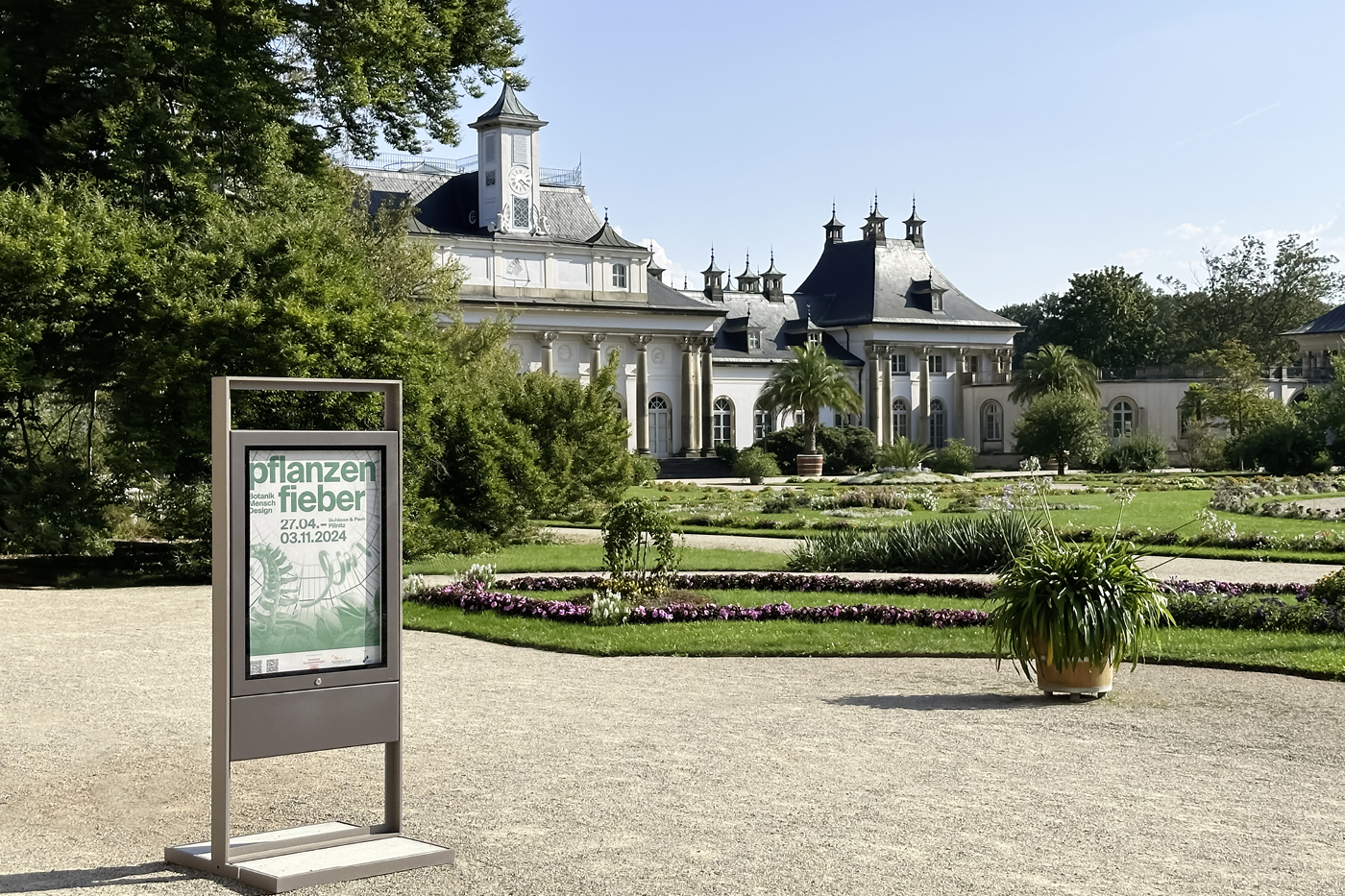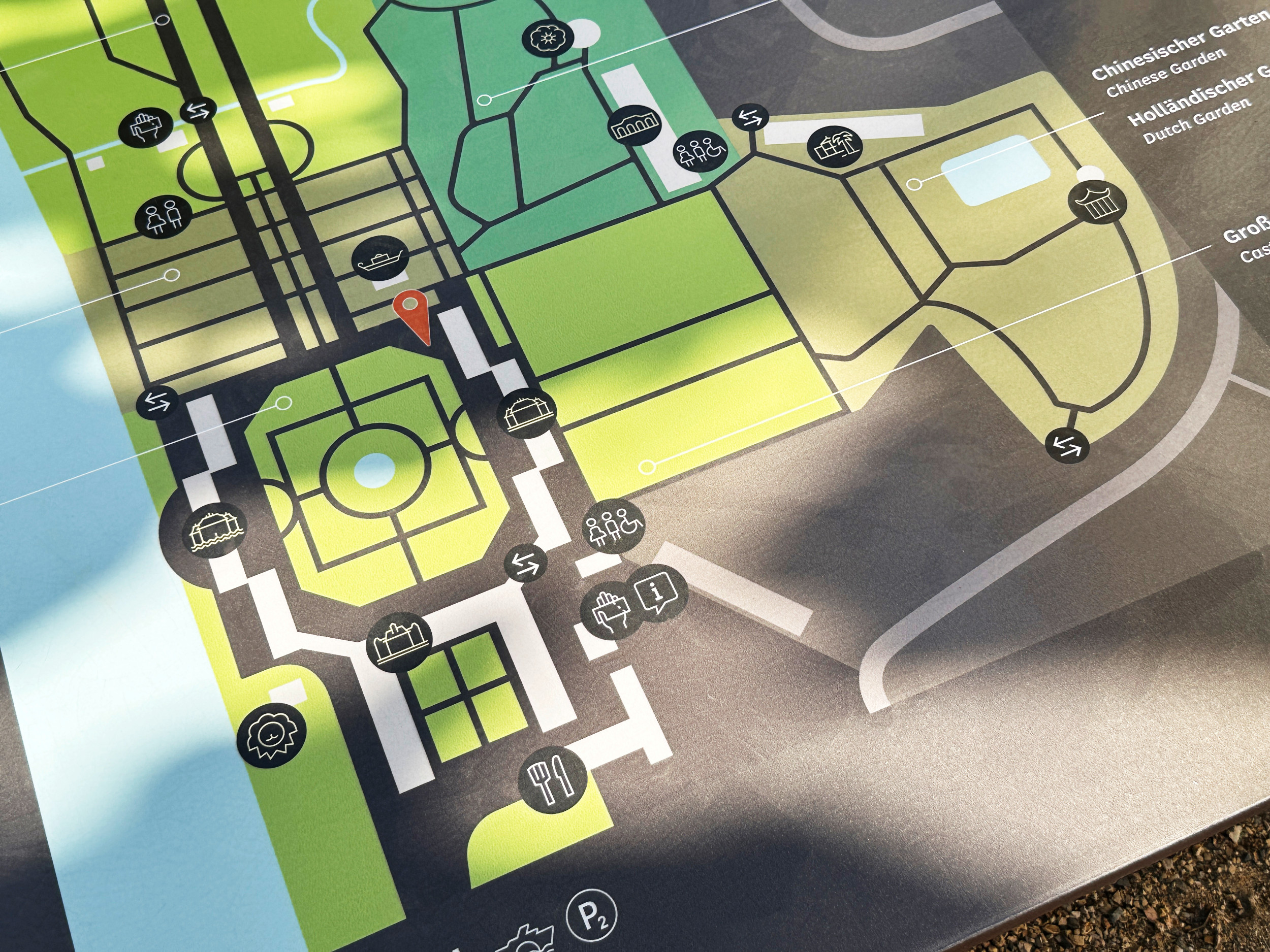 Glasierter Lavastein, bronzefarbene Rahmen, emaillierte Flächen – das Besucherleitsystem für die Schlösser, Burgen und Gärten Sachsens ist so hochwertig und zeitlos wie die Objekte selbst. Wie ein roter Faden zieht es sich durch den Schlosspark von Pillnitz – ohne sich dabei selbst in den Vordergrund zu stellen. Im Gegenteil: Die Stelen und Schilder unterstützen das Denkmal in seiner besonderen Wirkung und stellen den Besucher_innen alle wichtigen Informationen zur Verfügung.