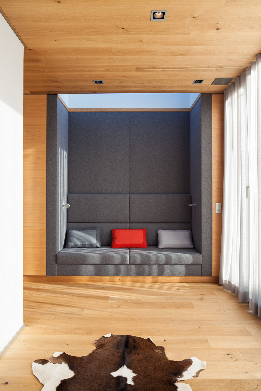 Die Fassade des Kubus ist mit hellem, glatt geschaltem Sichtbeton ausgeführt. Das Gebäudeinnere ist mit Eichenholz ausgekleidet. Den Übergang zum Bestandsgebäude formulierten wir als „gläserne Fuge“ um den Neubau mit einer leicht wirkenden Geste vom Bestand zu lösen. Eine als Lesesofa ausgebildete Wandnische mit eigenem Oberlicht dient als Rückzugsort vom Familienalltag...