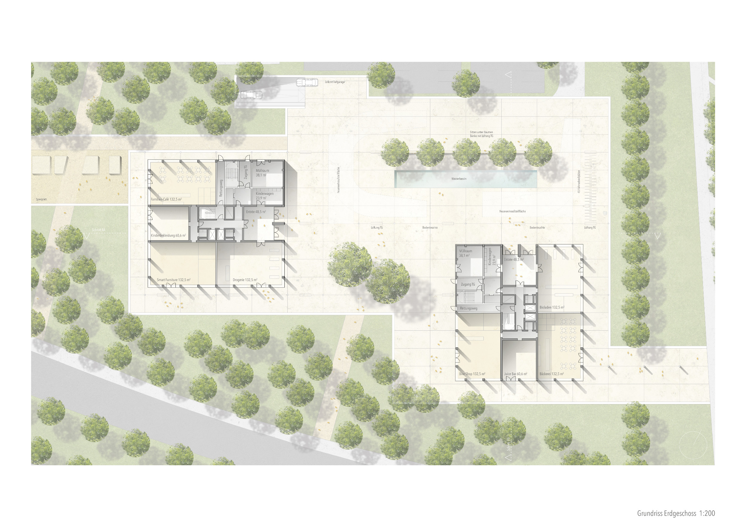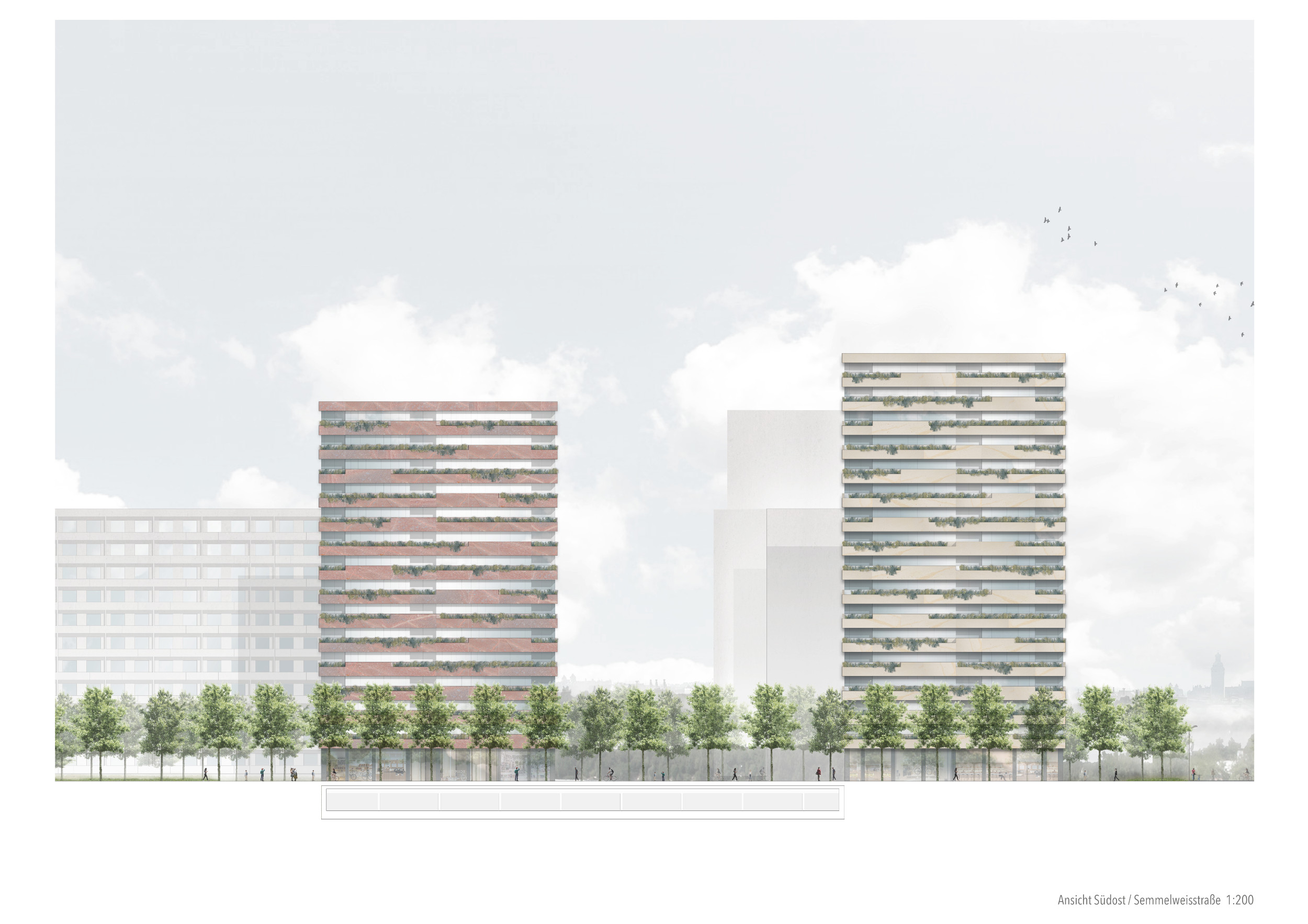 - Im Sinne der qualitätvollen Nachverdichtung wird die lokale Bautypologie mit einer weiteren Paarung aus zwei Punkthochhäusern fortgeschrieben.