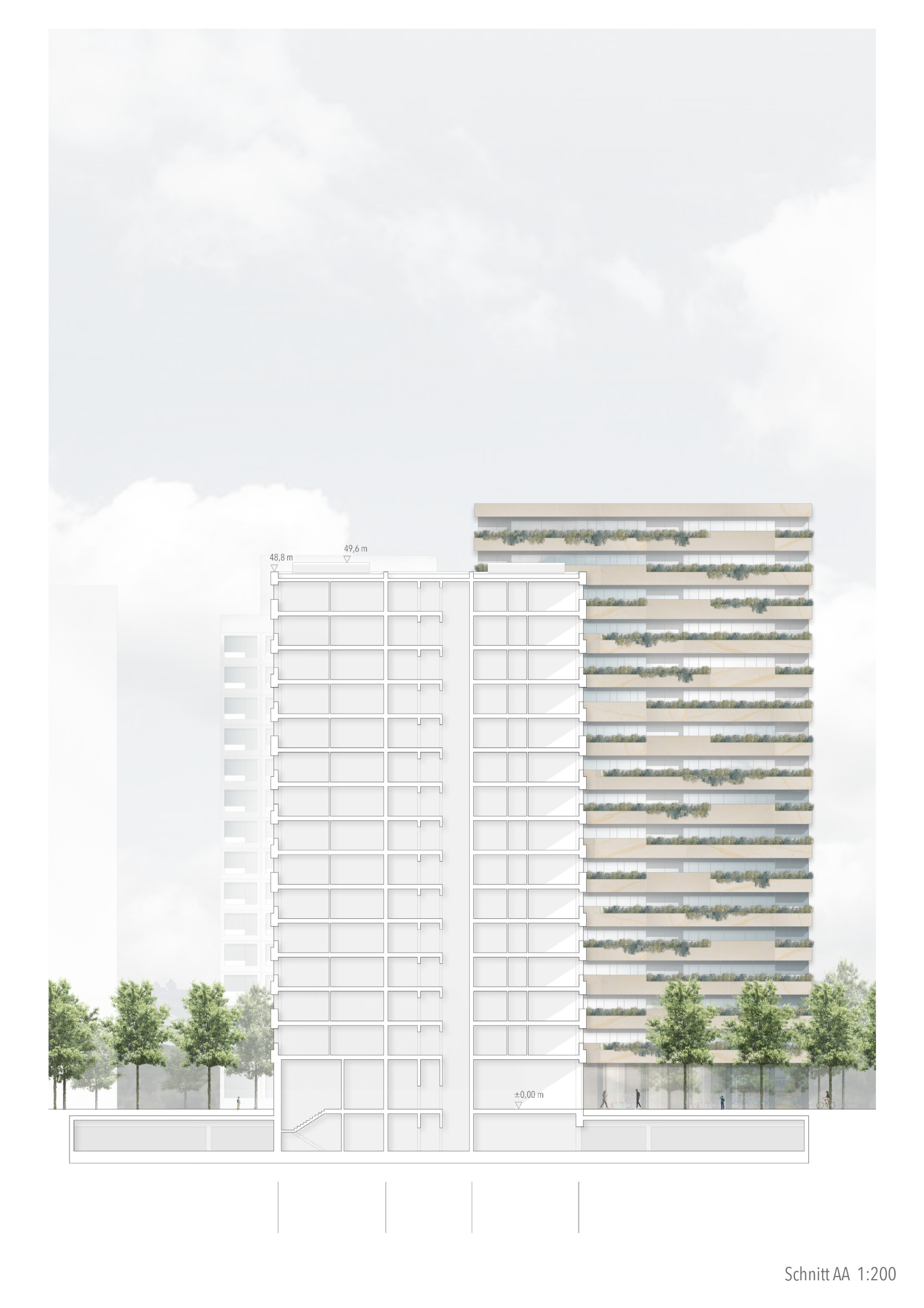 - Das 17-geschossige Punkthaus verläuft parallel zur Hauptachse und übernimmt eine formale Führungsposition. Das 15-geschossige Gebäude vermittelt durch seine parallele Anordnung und seine reduzierte Geschossigkeit zu den 11-geschossigen Wohnscheiben.